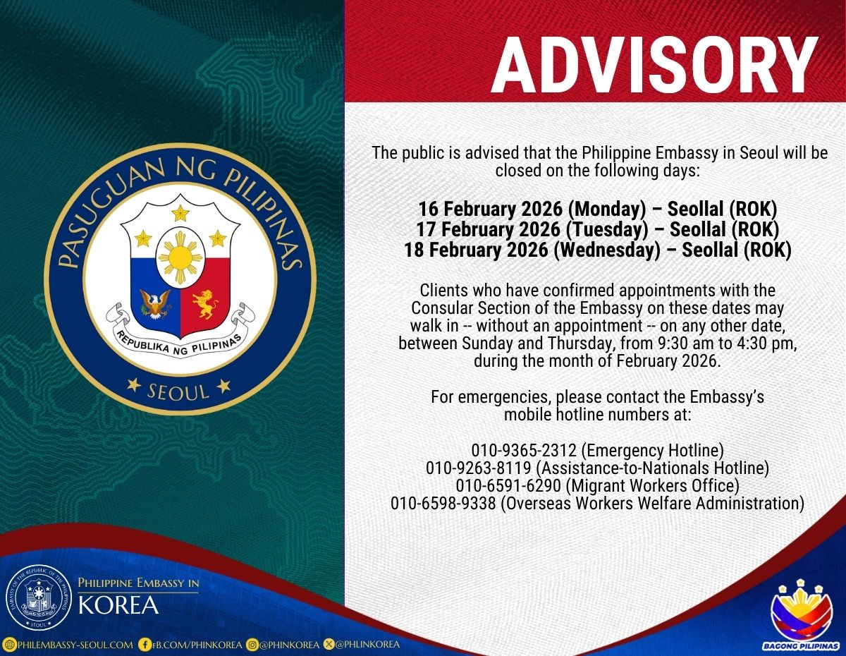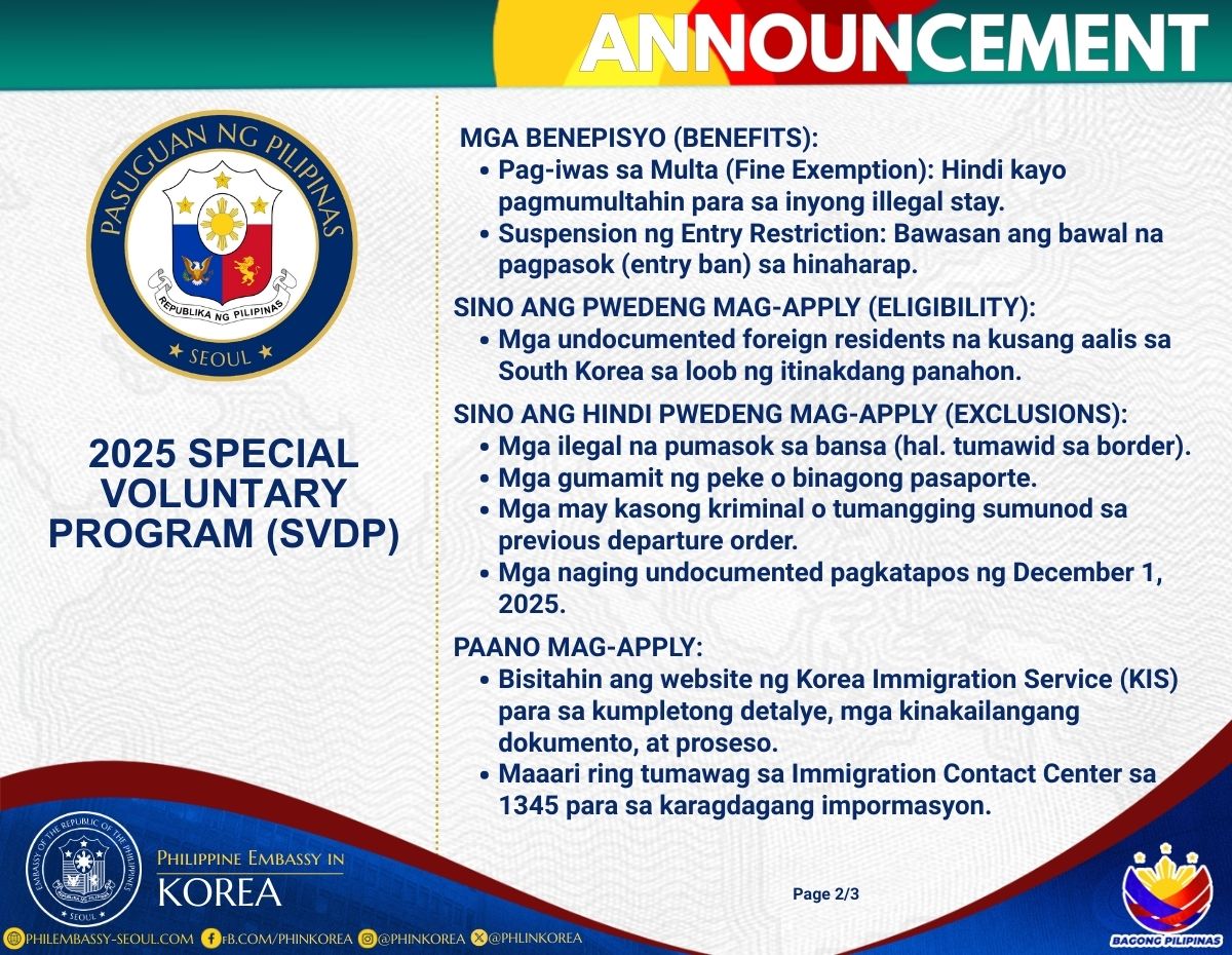 Ang Ministry of Justice ng South Korea ay naglulunsad muli ng "Special Voluntary Departure Program" (SVDP) para sa mga dayuhang residente na walang legal na status (undocumented) na nais kusang umalis sa South Korea sa itinakdang panahon.
