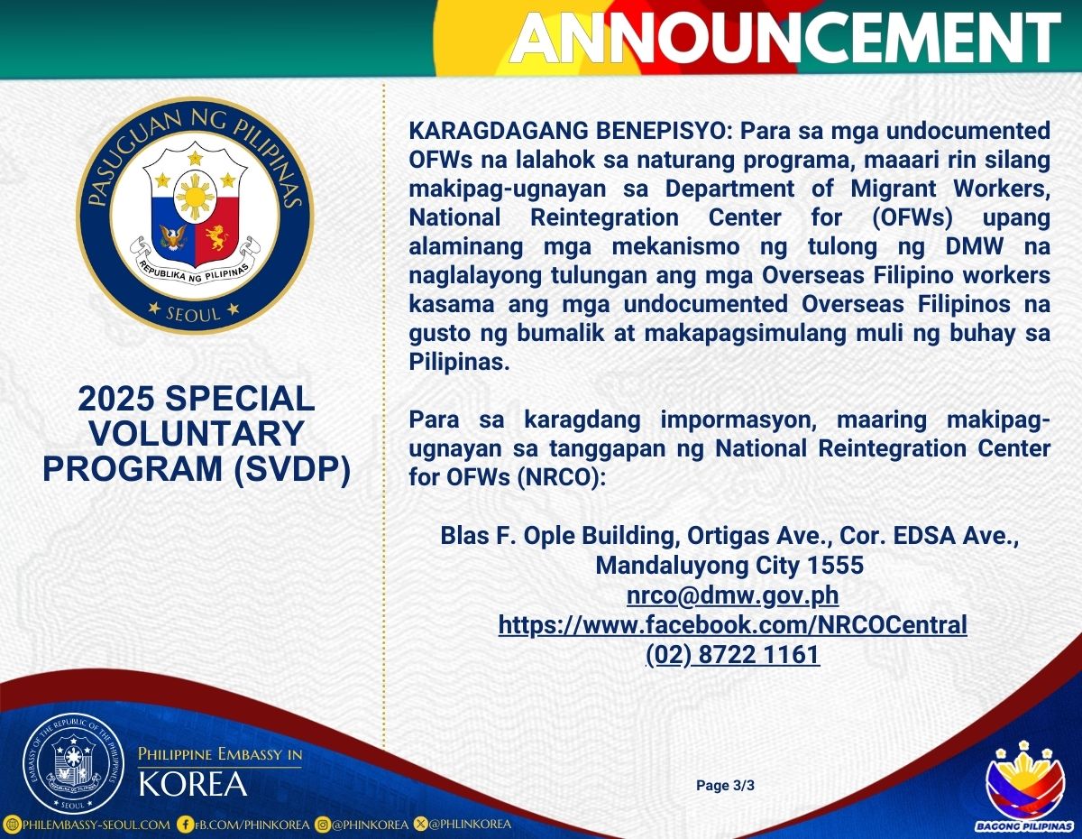 Para sa karagdang impormasyon, maaring makipag-ugnayan sa tanggapan ng National Reintegration Center for OFWs (NRCO):