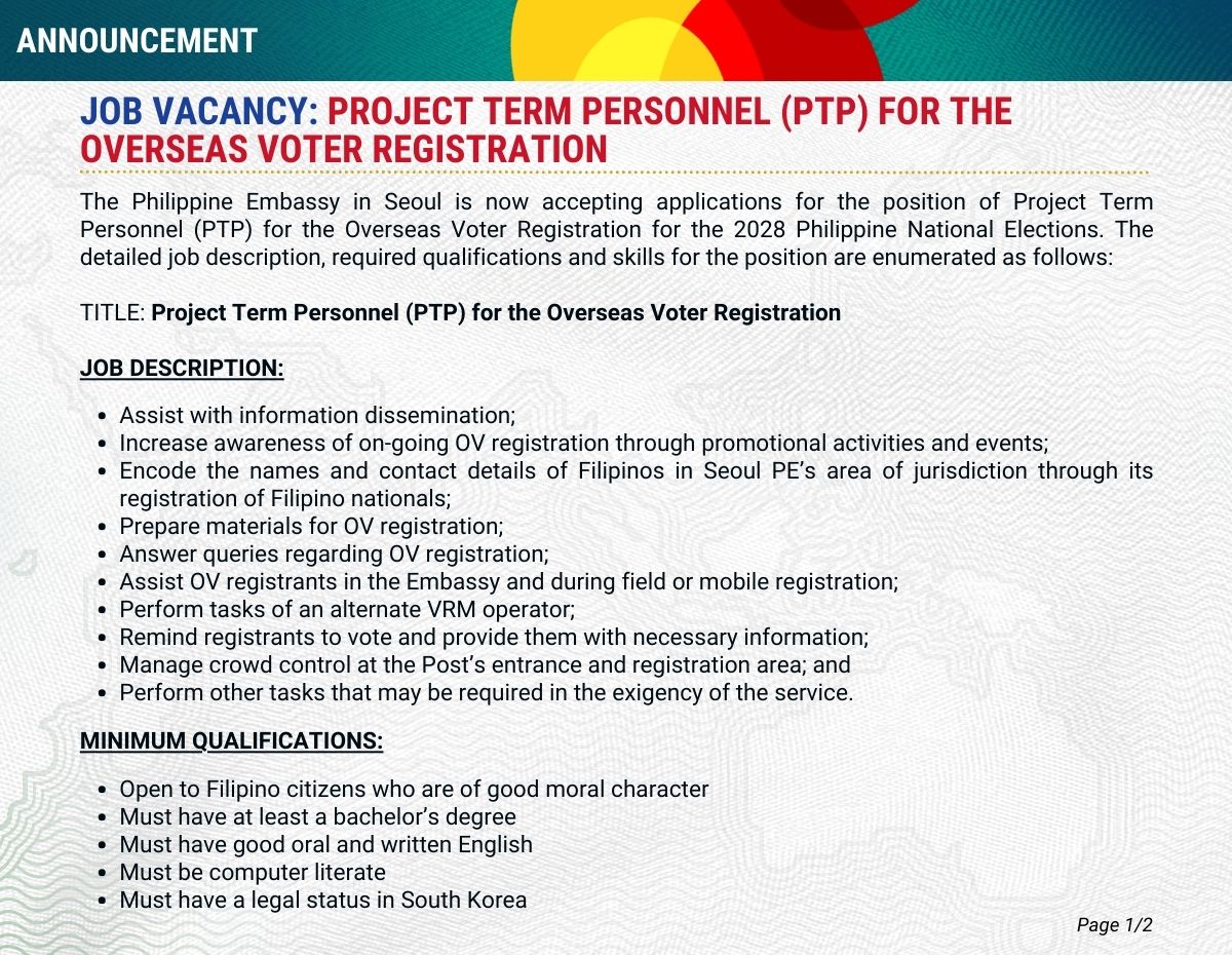 The Philippine Embassy wishes to inform the Filipino community that it will conduct a Consular Outreach and Overseas Voter Registration Mission on 17 August 2024 (9:00 AM - 6:00 PM) at the Sanjeongro 18beongil 16 Gwangsan-gu, Gwangju Metropolitan City and 18 August 2024 (9:00 AM - 12:00 NN) at the Pyeongdong Wolcheon Park, Gwangju.