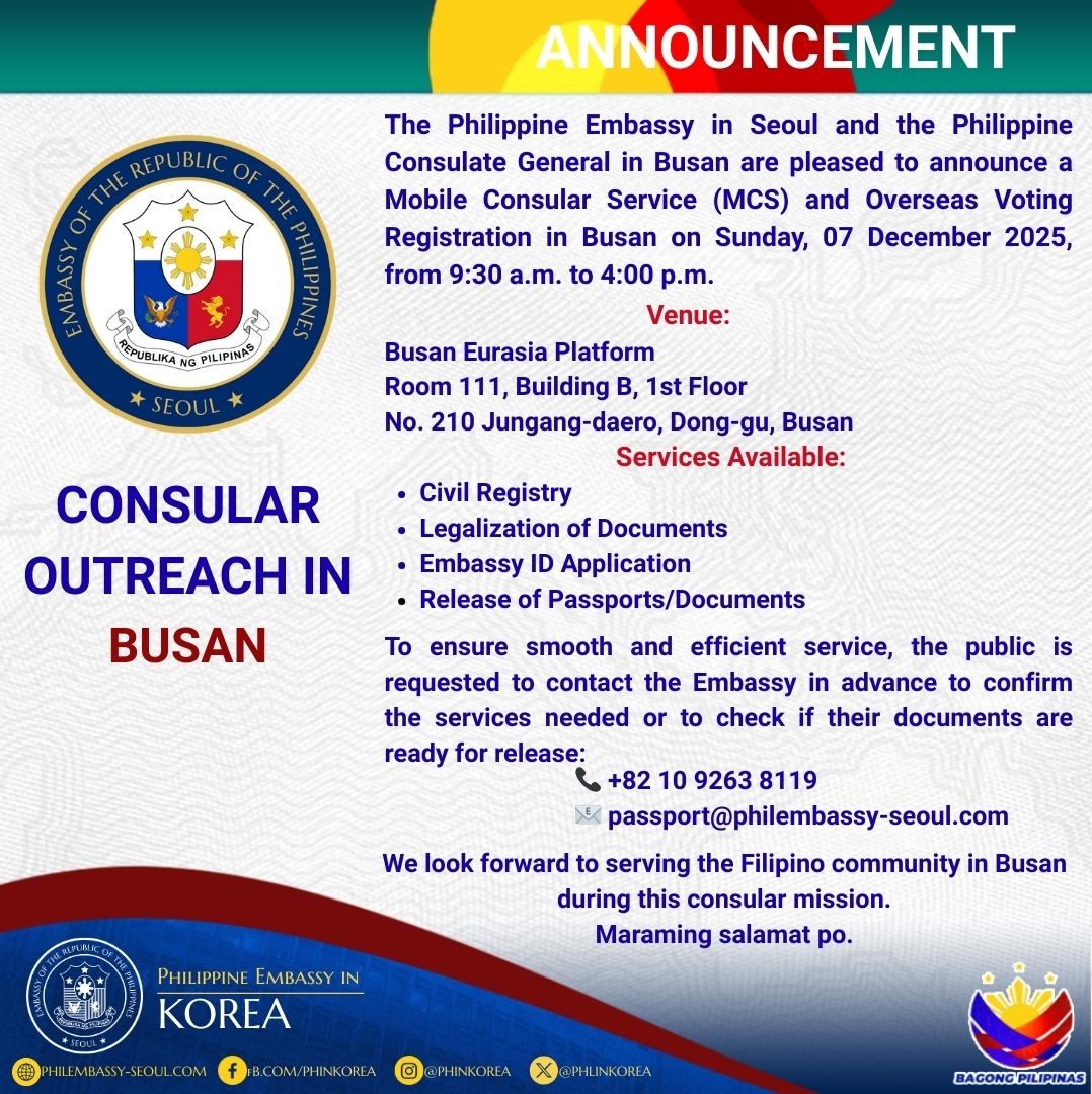 The Philippine Embassy in Seoul and the Philippine Consulate General in Busan are pleased to announce a Mobile Consular Service (MCS) and Overseas Voting Registration in Busan on Sunday, 07 December 2025, from 9:30 a.m. to 4:00 p.m.