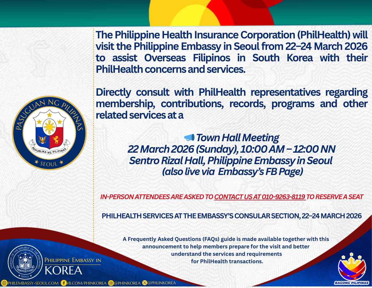 The Embassy of the Philippines in Seoul invites Filipinos in Korea to watch Filipino films participating in this year’s Busan International Film Festival. For more information on the films and the festival, visit www.biff.kr