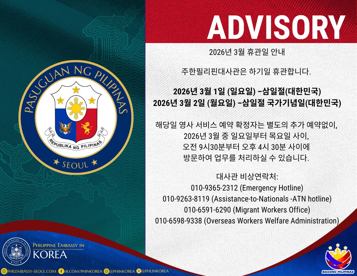 The Philippine Embassy in Seoul informs the public that the Pag-IBIG Fund South Korea Member Services Desk and SSS–Seoul will be temporarily unable to accommodate walk-in clients on 25 January 2026 due to an official onsite service in Busan. Both services will resume regular operations on 26 January 2026. For urgent concerns, please contact: Pag-IBIG Fund South Korea E-mail: vo_eastasia@pagibigfund.gov.ph SSS–SeoulE-mail: korea@sss.gov.ph Thank you for your understanding.