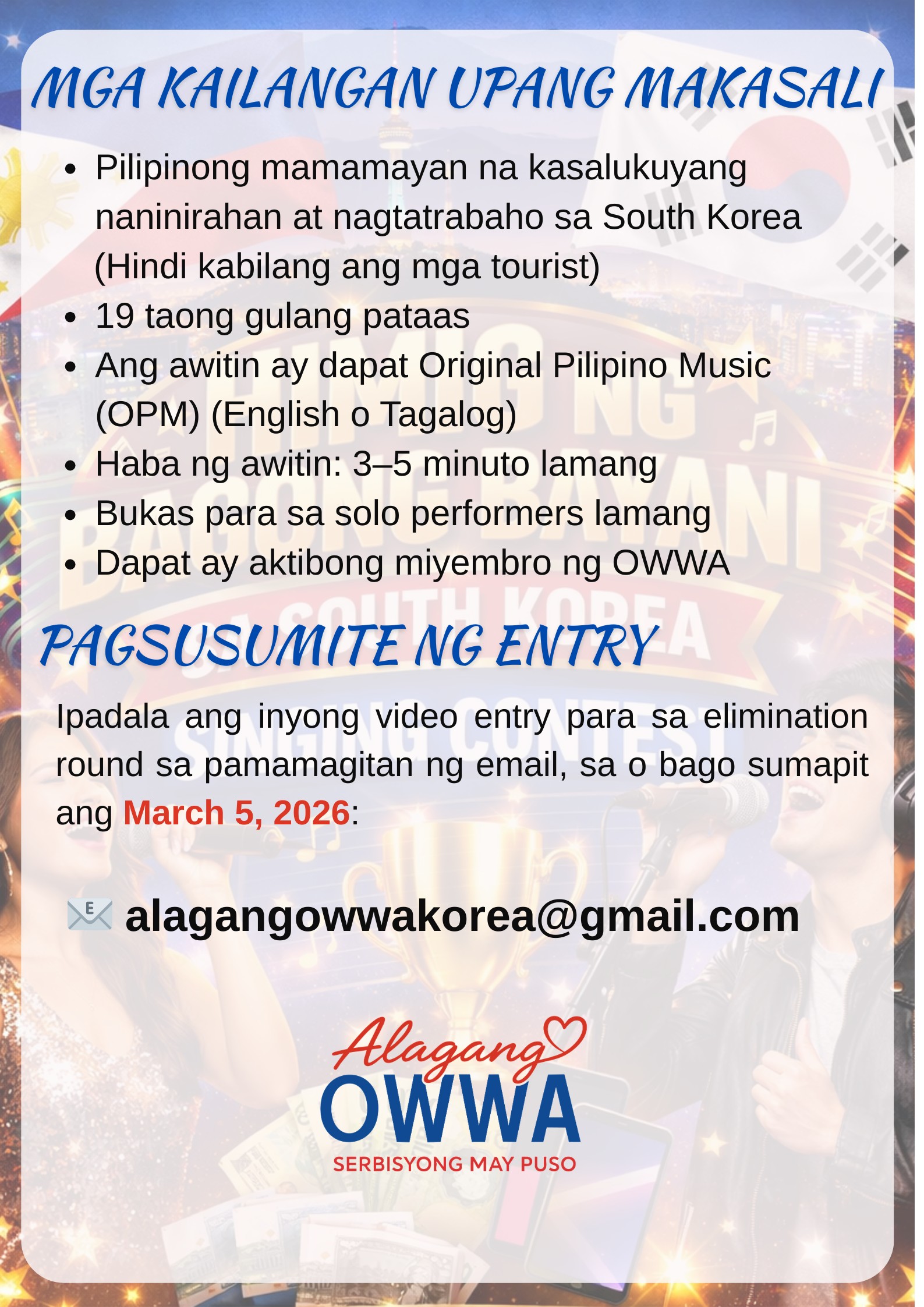 Kung ikaw ay isang OFW sa South Korea na may puso sa pag awit, ito na ang iyong pagkakataon na ipakita ang iyong galing at upang maging Bagong Bayani sa Entablado.