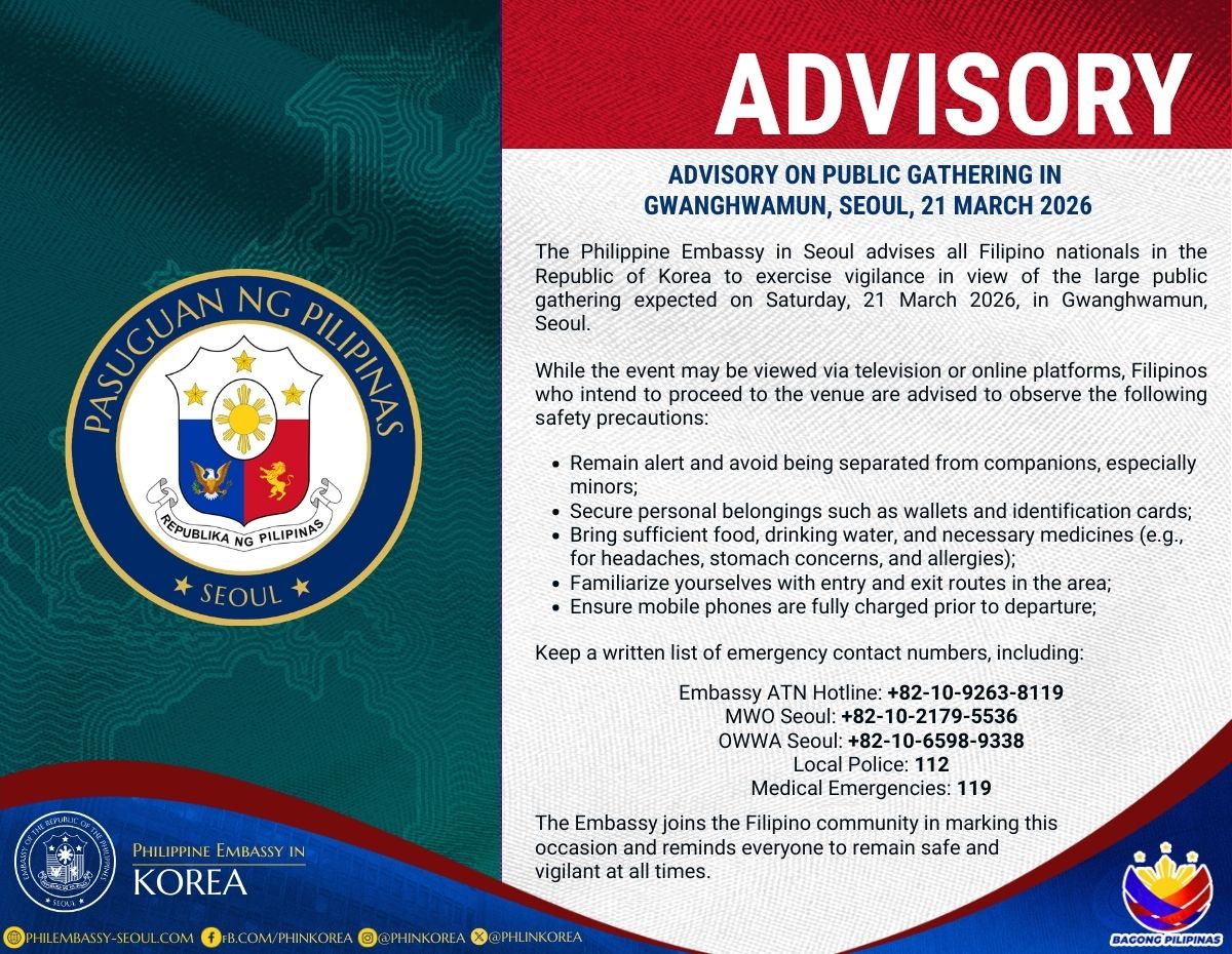 The Philippine Embassy in Seoul advises all Filipino nationals in the Republic of Korea to exercise vigilance in view of the large public gathering expected on Saturday, 21 March 2026, in Gwanghwamun, Seoul.