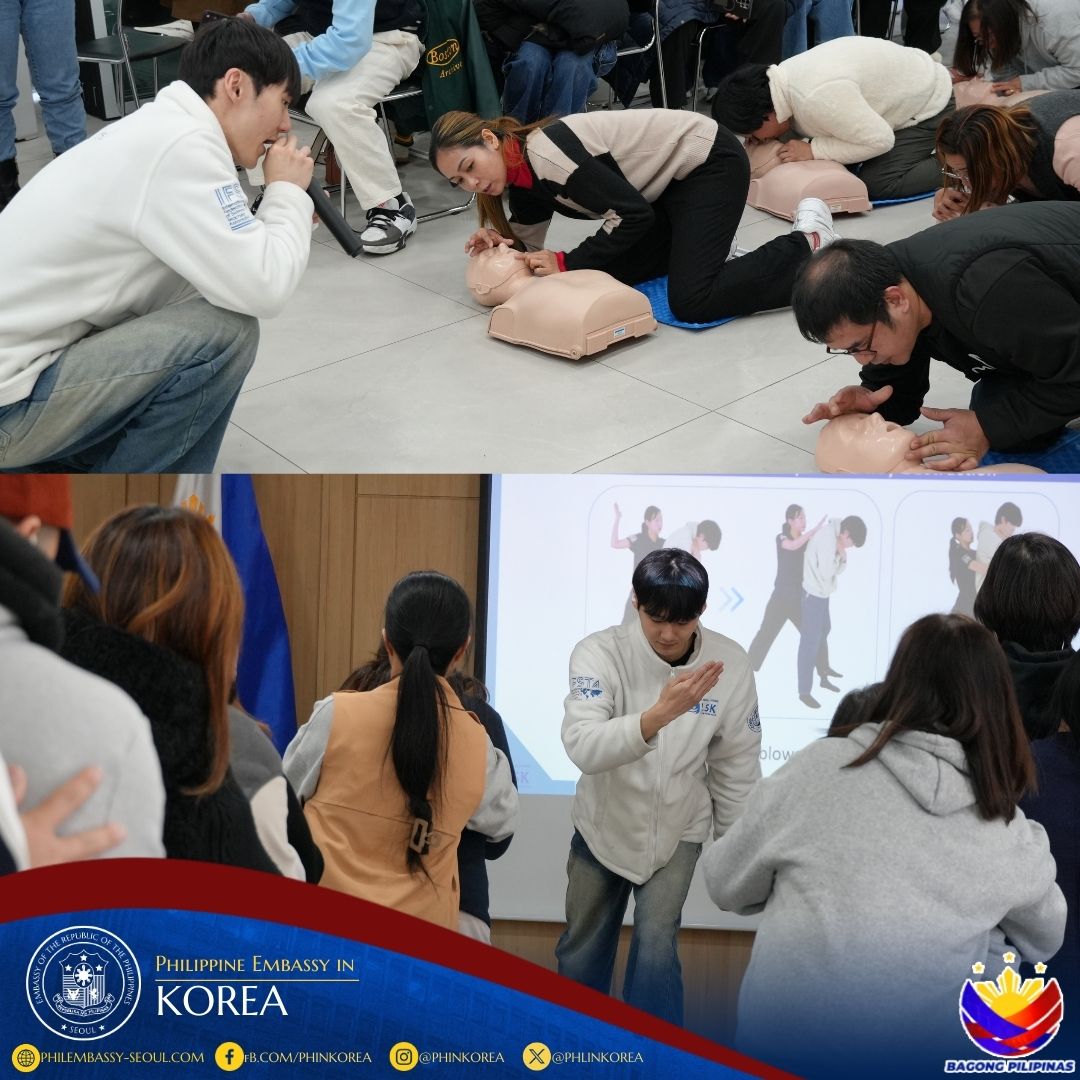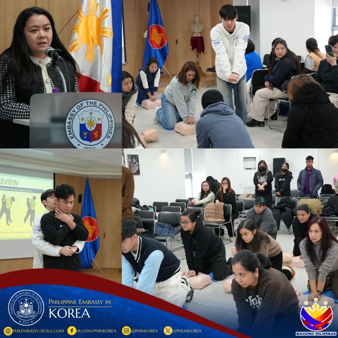 8 February 2026, Seoul - The Philippine Embassy in Seoul, through the Migrant Workers Office (MWO) and the Overseas Workers Welfare Administration (OWWA) South Korea, successfully conducted a Cardio Pulmonary Resuscitation (CPR) Training for Overseas Filipino Workers (OFWs) and Overseas Filipinos (OFs) on February 8, 2026, at the 2nd Floor, Sentro Rizal Hall, Philippine Embassy. A total of sixty-four (64) participants actively took part in the life-saving skills training.