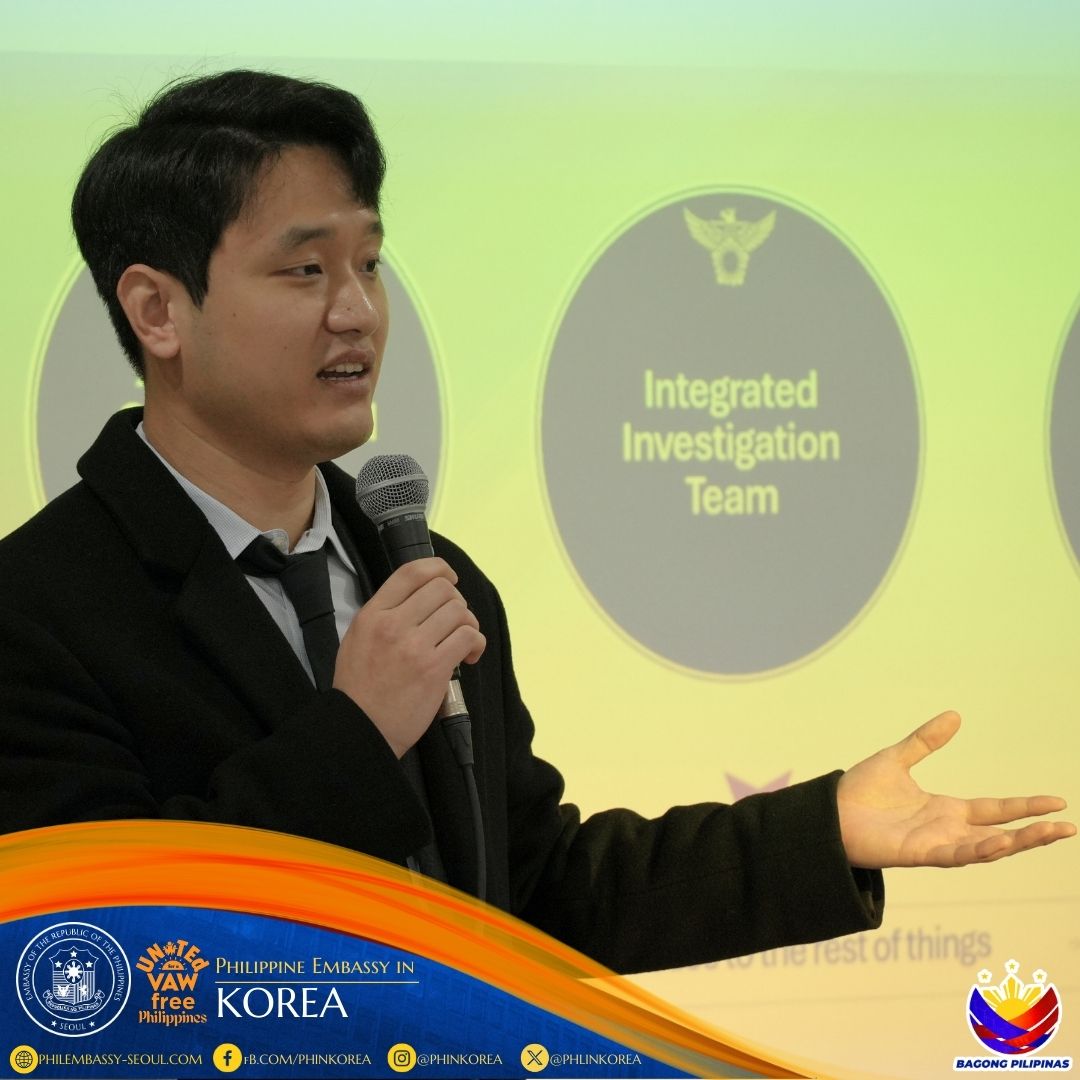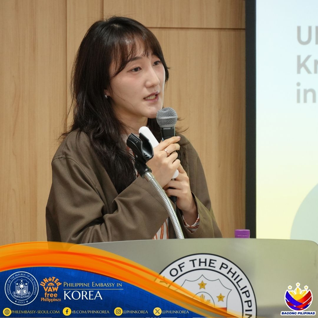 The forum’s resource speakers provided diverse, practical and forward-looking insights. Ms. Gichelle Cruz, from the PCW GAD Resource Pool, shared essential digital protection tools tailored for Filipinos in Korea; Mr. Ahn Sung-pil, of the Yongsan Metropolitan Police, offered guidance on legal rights and available mechanisms in the ROK for preventing and responding to tech-based gender violence; and Ms. Sujung An, from UN Women, provided a global overview of emerging trends such as AI-driven misinformation, normalization of harmful online content, and the growing vulnerability of young male demographics due to digital isolation. The session was moderated by Third Secretary and Vice Consul Reisha Olavario, who serves as the Embassy’s GAD Focal Officer.