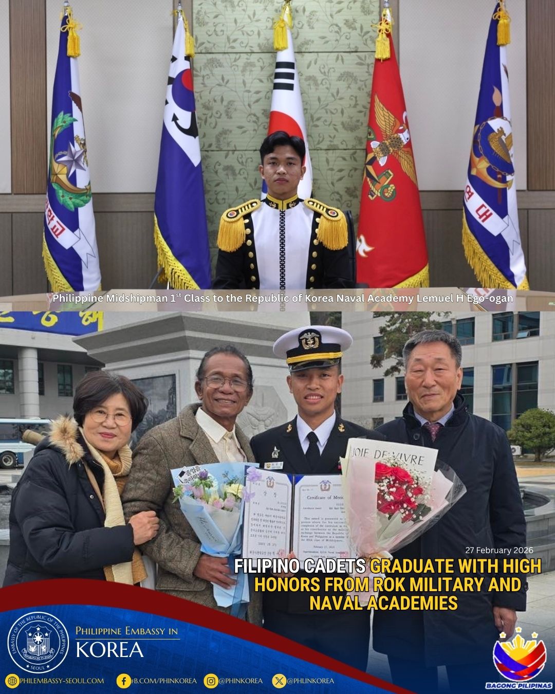 27 February 2026, Seoul and Changwon, ROK. The Philippine Embassy in Seoul congratulates Philippine Cadet 1st Class Guidson T. Domingo of the Korea Military Academy (KMA) and Philippine Midshipman 1st Class Lemuel H. Ego-ogan of the Republic of Korea Naval Academy (ROKNA) on their graduation on 27 February 2026, reflecting the continued excellence of Filipino cadets in premier ROK military institutions and the enduring strength of Philippines–Republic of Korea defense cooperation, including academic exchanges between our armed forces.