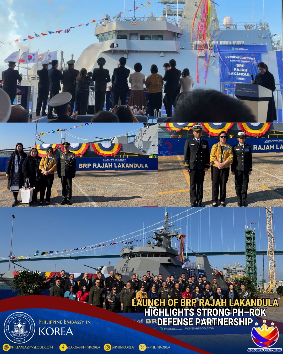 Ulsan, Republic of Korea – The Philippine Embassy in Seoul, led by Ambassador-designate Bernadette Therese Fernandez, joined the official launching of the BRP Rajah Lakandula on 20 November 2025 at the HD Hyundai Heavy Industries (HHI) shipyard in Ulsan, highlighting the expanding strategic and economic significance of the Philippine–Republic of Korea defense partnership, particularly in the area of defense industrial cooperation.