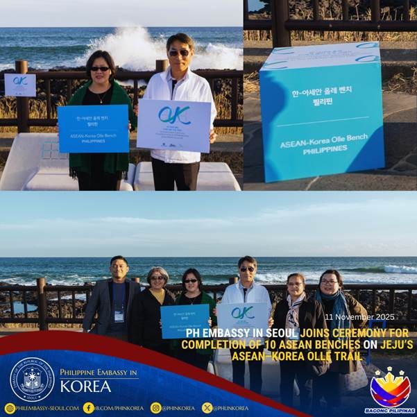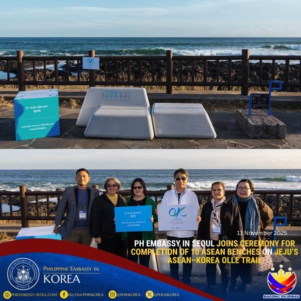 The Philippine bench, located along the Yerae Coastal Road where freshwater meets the sea, serves as a permanent marker introducing Jeju visitors to Philippine culture and tourism. Its installation supports ASEAN–Korea people-to-people exchanges, enhances Philippine visibility in Jeju, and aligns with the country’s foreign policy goals of strengthening regional partnerships and expanding tourism cooperation.