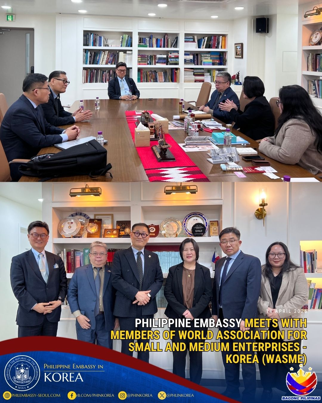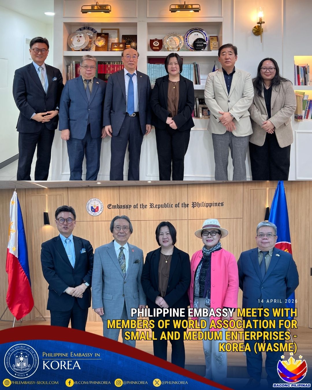 14 April 2026, Seoul. Philippine Embassy in Seoul officials met members of the World Association for Small and Medium Enterprises (WASME) led by Secretary General Sung-woo Rhee during their visit to the Embassy on 14 April 2026 to introduce their industries. The group consists of representatives from Korean SMEs offering products and services ranging from pharmaceuticals, cosmetics, consulting services, manufacturing, creative industry and automotive maintenance.