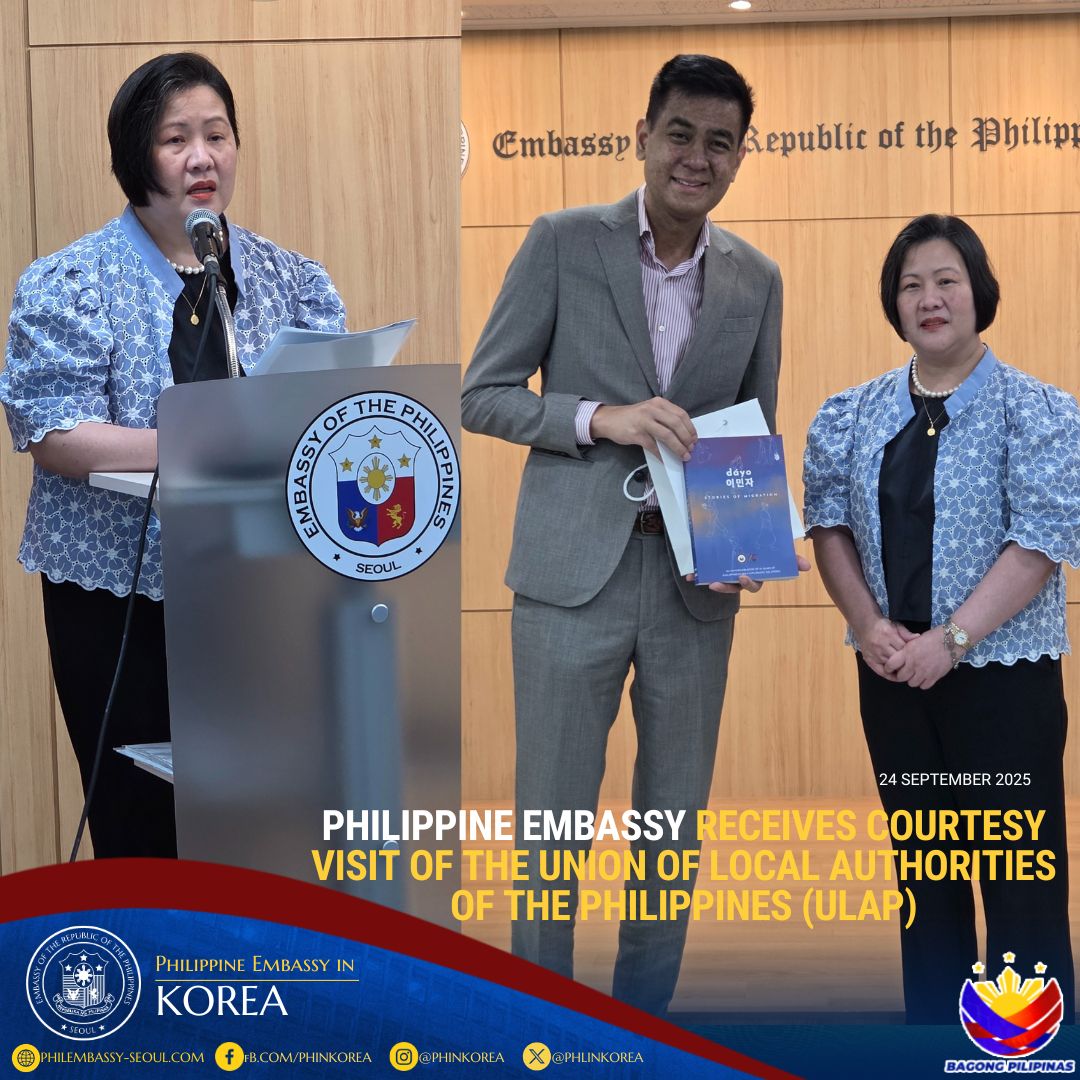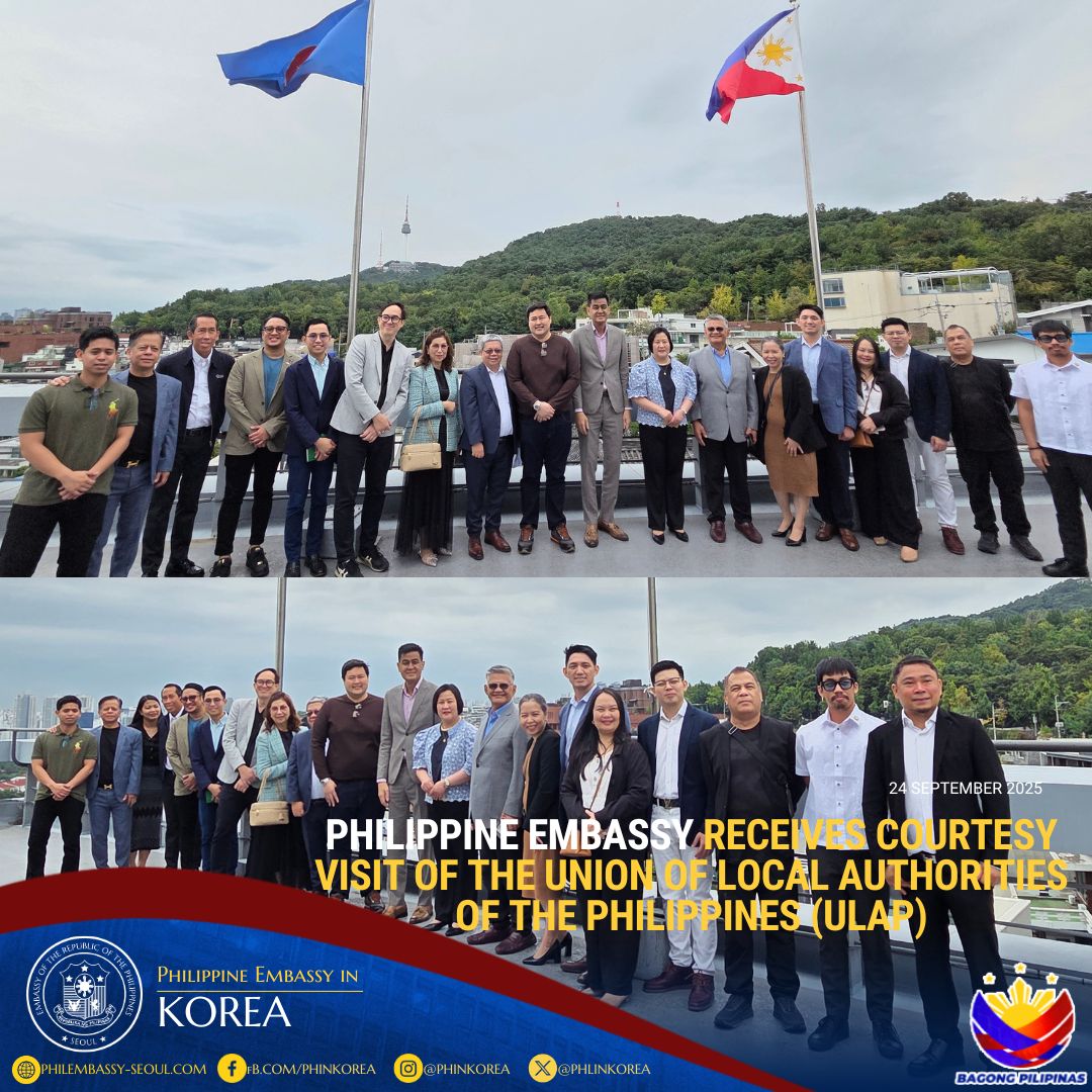 Seoul, Republic of Korea – The Philippine Embassy in Seoul led by Ambassador-designate Bernadette Therese C. Fernandez received the courtesy call of the delegation from the Union of Local Authorities of the Philippines (ULAP) on 24 September 2025. ULAP, as recognized by E.O. 351, s. 2004, is the umbrella organization of all leagues of local government units (LGUs) and leagues and federations of local elective and appointive officials. It serves as the focal representative and mouthpiece of the subnational government in all policy and program platforms to amplify a unified advocacy towards the strengthening of the LGUs into able partners in nation-building.