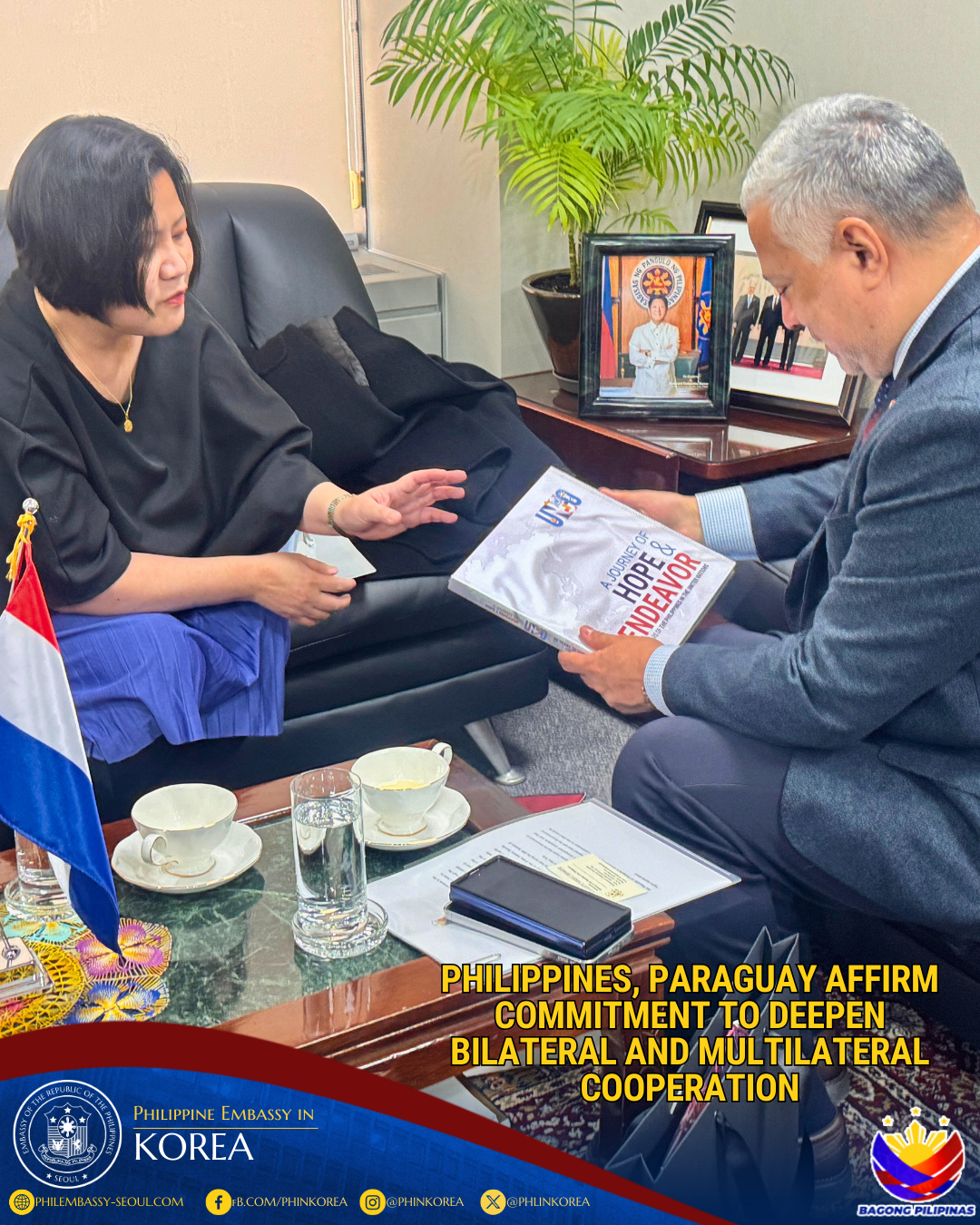 26 January 2026, Seoul–Philippine Ambassador to the Republic of Korea H.E. Bernadette Therese C. Fernandez received Mr. Sang-soo Jun, the Republic of Korea’s Candidate for Secretary General of the Inter-Parliamentary Union (IPU), in a courtesy call at the Philippine Embassy in Seoul on 26 January 2026. During the meeting, Mr. Jun shared his vision for a more inclusive and future-ready IPU, underscoring the importance of parliamentary cooperation in addressing global challenges such as climate change, sustainable development, gender equality, good governance, and responsible fiscal management. He likewise highlighted the role of digital innovation, including e-parliament and AI-enabled parliamentary systems, in strengthening democratic institutions, particularly in developing countries.