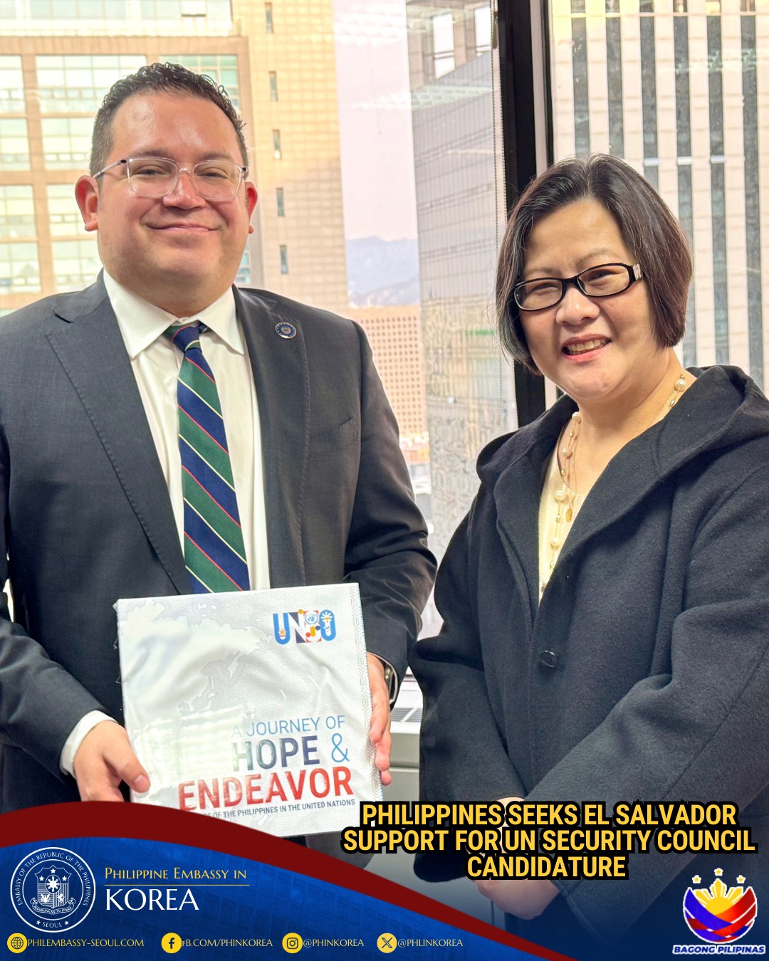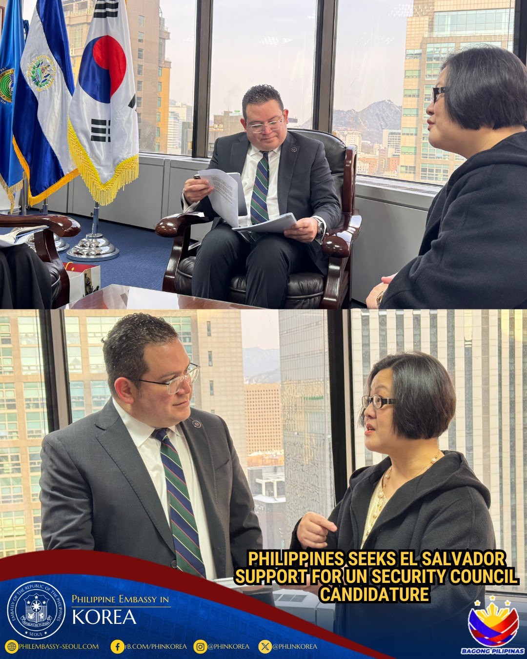 20 January 2026 – Philippine Ambassador to the ROK Bernadette Therese C. Fernandez paid a courtesy call on H.E. Federico Miguel Guerrero Avendaño, Ambassador of the Republic of El Salvador to the Republic of Korea, reaffirming the warm and friendly relations between the Philippines and El Salvador.