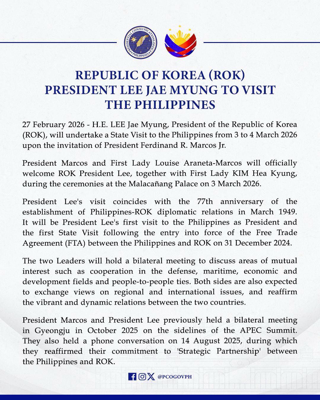 MANILA 11 September 2025 — The Department of Foreign Affairs takes note of the posting on Facebook by the President of South Korea on a project proposal submitted to South Korea for funding.