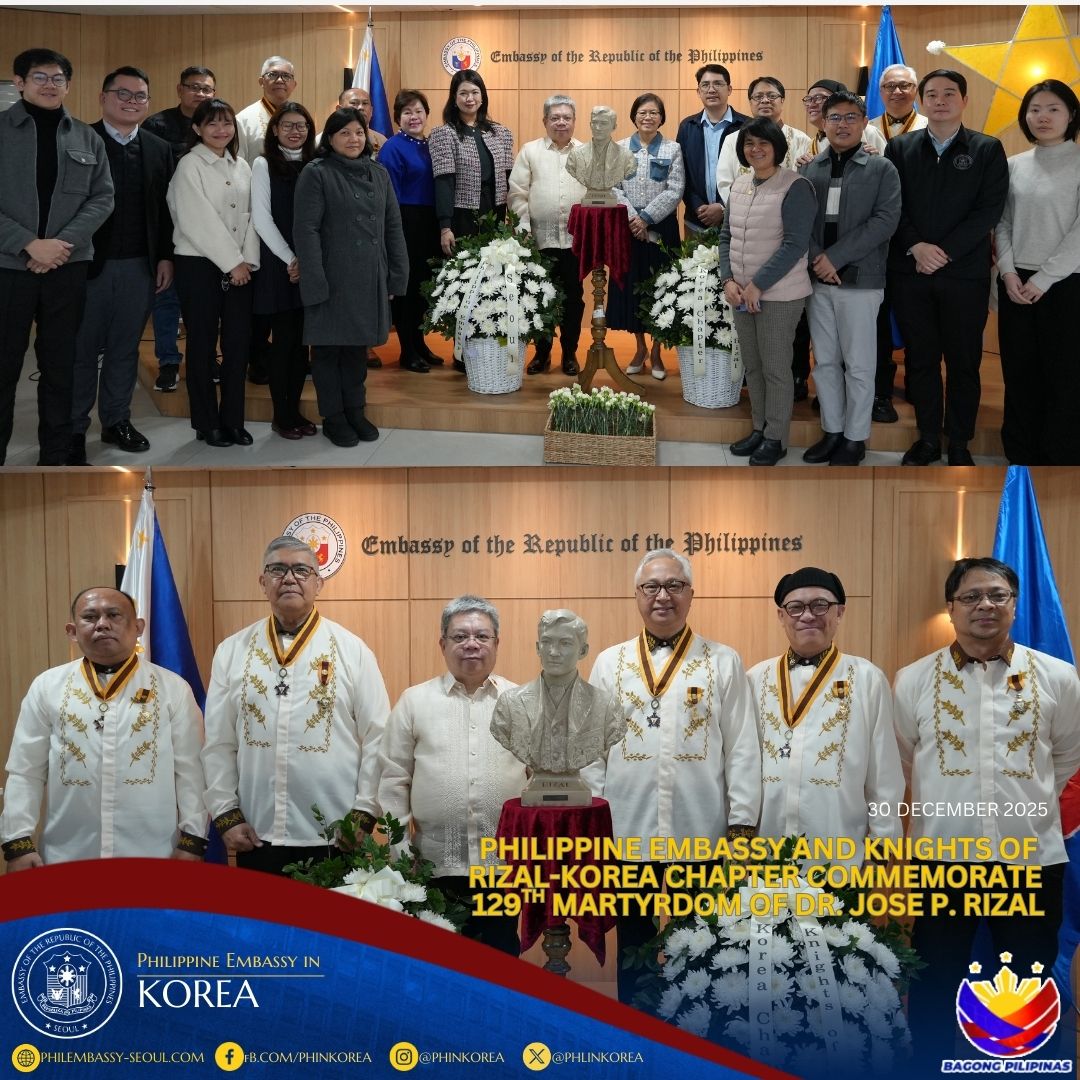30 December 2025, Seoul. The Philippine Embassy in Seoul and the Knights of Rizal – Korea Chapter held a solemn wreath offering to commemorate the 129th Anniversary of the Martyrdom of Dr. Jose P. Rizal, with this year’s theme as “Rizal: Sa Pagbangon ng mga Mamamayan, Aral at Diwa Mo ang Tunay na Gabay” (Rizal: As Our People Rise, Your Teachings and Wisdom Guide Our Way).