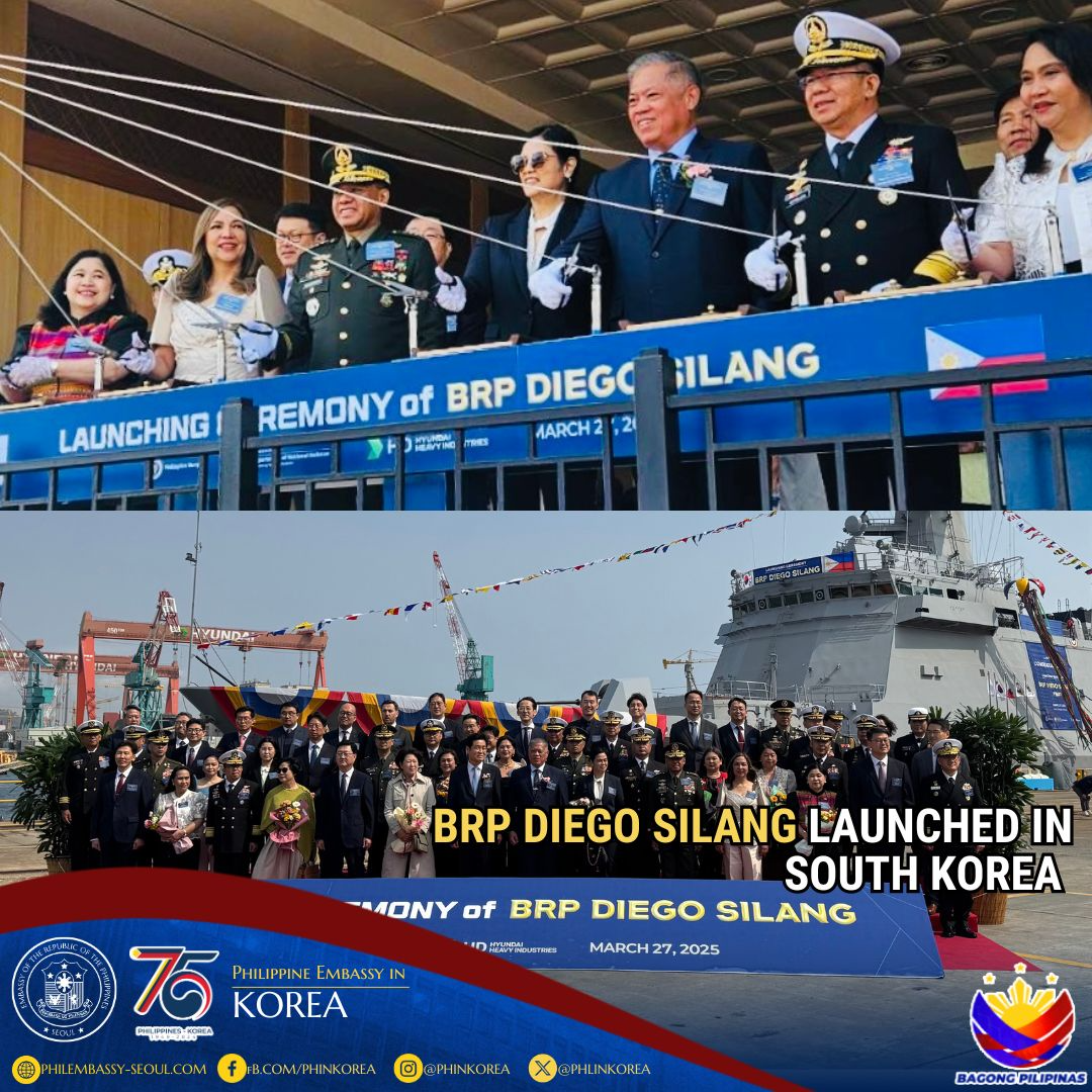 Ulsan, Republic of Korea - The Philippine Embassy in Korea, led by Ambassador Theresa Dizon-De Vega, took part in the official launching of the Philippine Navy’s second 3,200-ton frigate BRP Diego Silang at the Hyundai Heavy Industries (HHI) headquarters in Ulsan on 27 March 2025. DND, AFP, and ROK government officials were on hand to witness the ceremony.