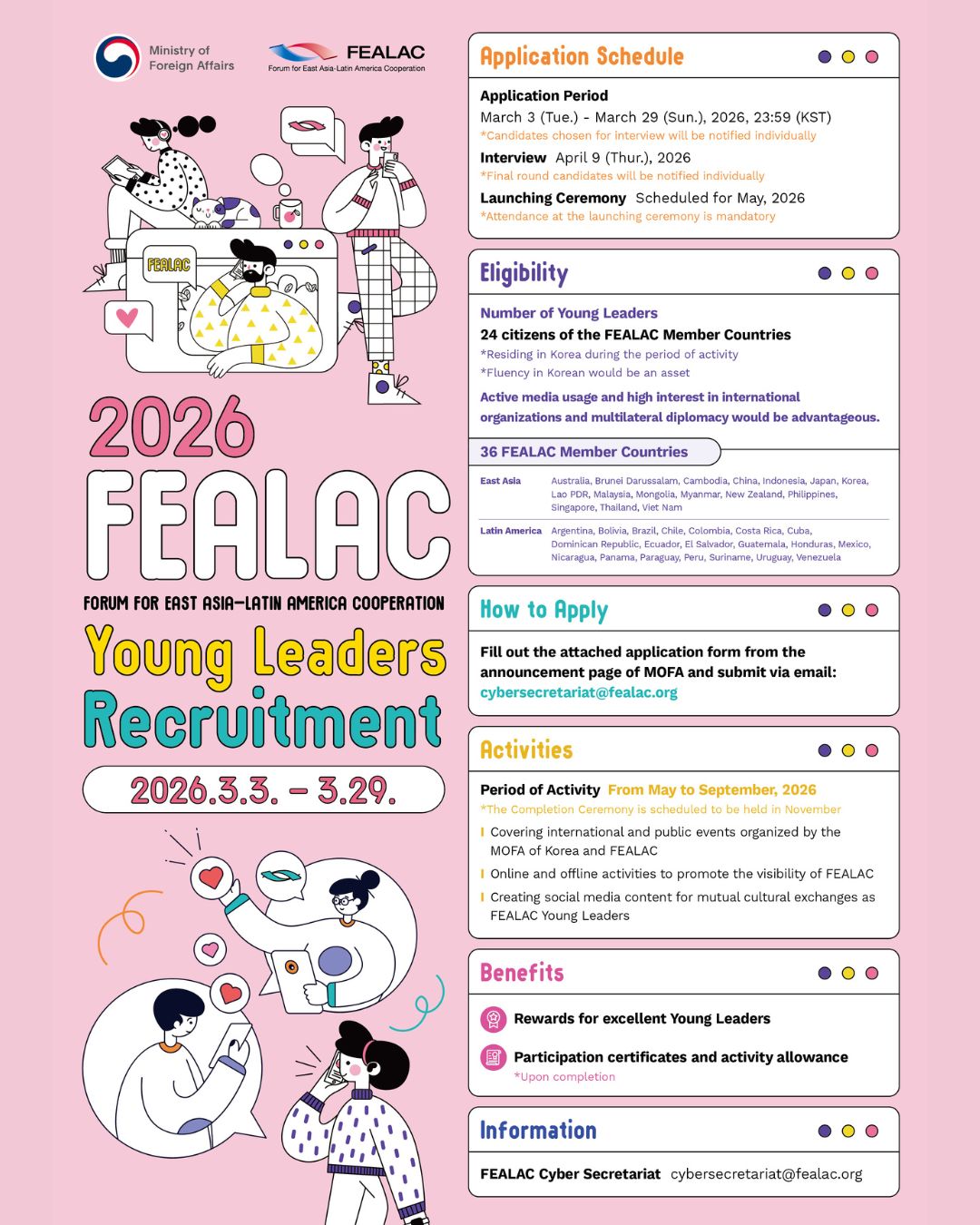 The Philippine Embassy in Seoul invites you to join the 2026 FEALAC Young Leaders Program—an exciting opportunity to represent the Philippines, engage in regional issues, and create impactful content on East Asia–Latin America relations.