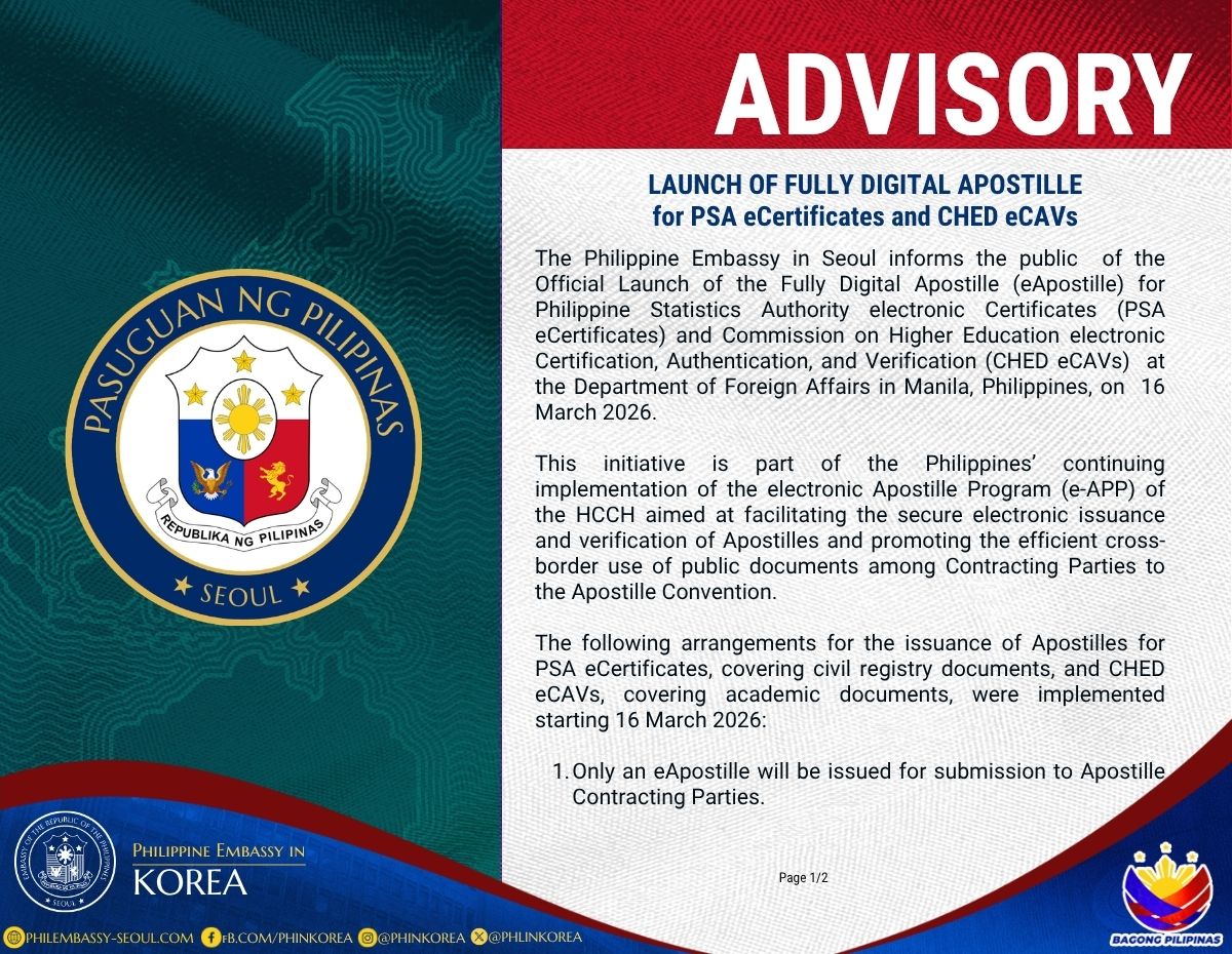 Pinapaalalahanan ng Embahada ng Pilipinas sa Seoul ang lahat ng Pilipino sa Republika ng Korea na mag-ingat at maging mapagmatyag kaugnay ng inaasahang malaking pagtitipon sa Sabado, 21 Marso 2026, sa Gwanghwamun, Seoul. Maaaring mapanood ang nasabing okasyon sa telebisyon o online. Subalit para sa mga tutungo sa lugar, pinapayuhan ang sumusunod: