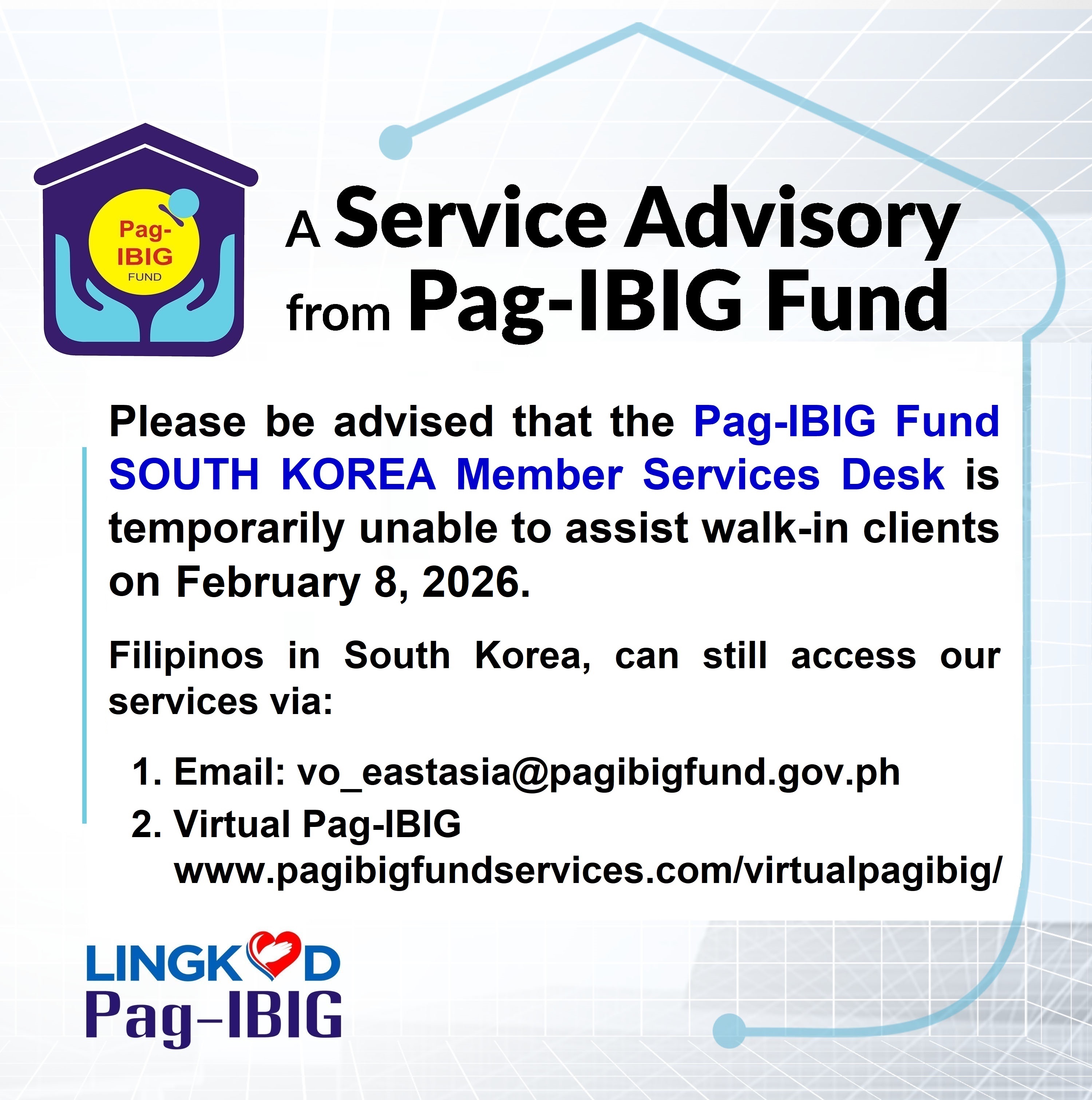 The Philippine Embassy in Seoul informs the public that the Pag-IBIG Fund South Korea Member Services Desk and SSS–Seoul will be temporarily unable to accommodate walk-in clients on 08 February 2026 due to an official onsite service in Daegu. Both services will resume regular operations on 09 February 2026. For urgent concerns, please contact: Pag-IBIG Fund South KoreaE-mail: vo_eastasia@pagibigfund.gov.ph