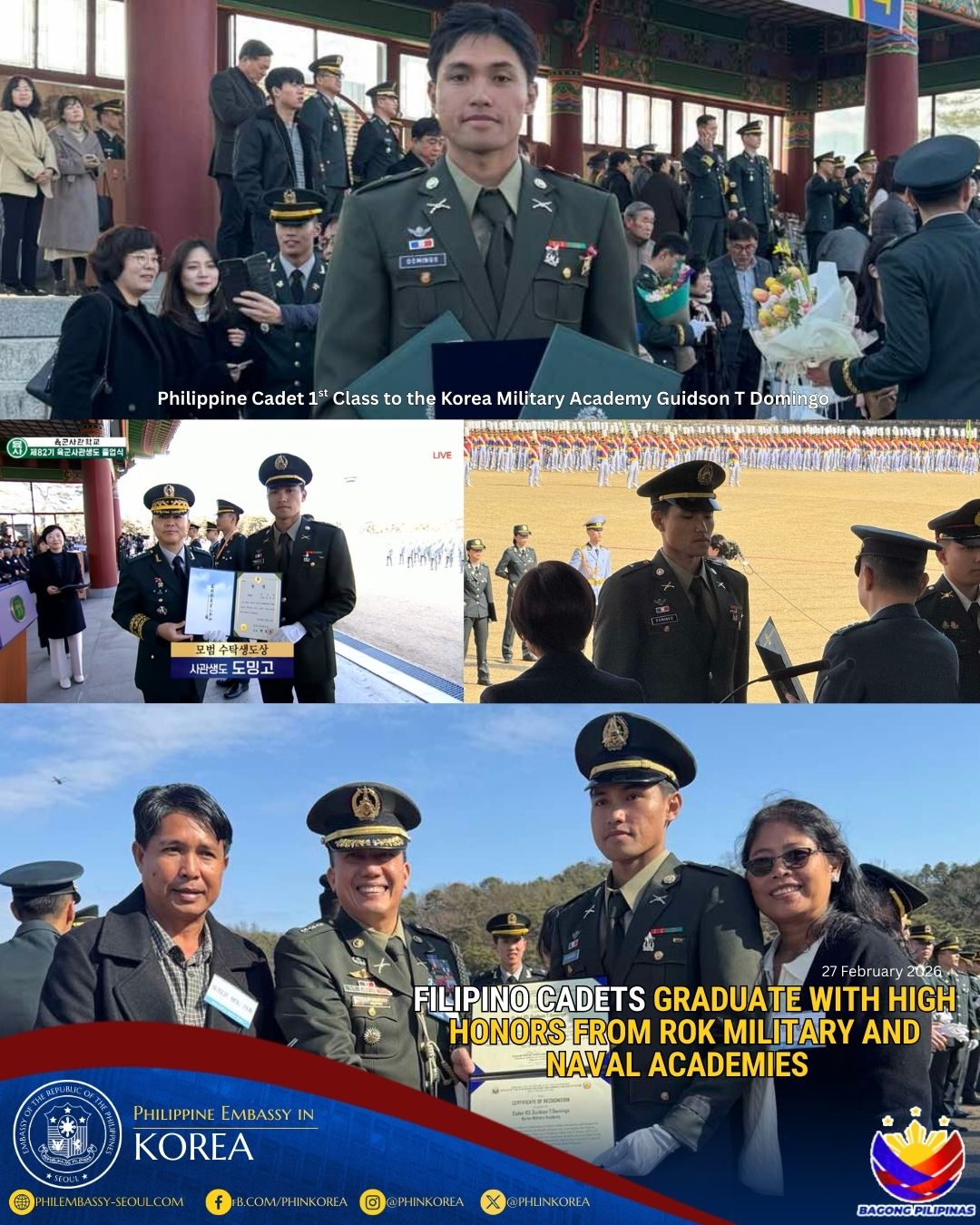 27 February 2026, Seoul and Changwon, ROK. The Philippine Embassy in Seoul congratulates Philippine Cadet 1st Class Guidson T. Domingo of the Korea Military Academy (KMA) and Philippine Midshipman 1st Class Lemuel H. Ego-ogan of the Republic of Korea Naval Academy (ROKNA) on their graduation on 27 February 2026, reflecting the continued excellence of Filipino cadets in premier ROK military institutions and the enduring strength of Philippines–Republic of Korea defense cooperation, including academic exchanges between our armed forces.