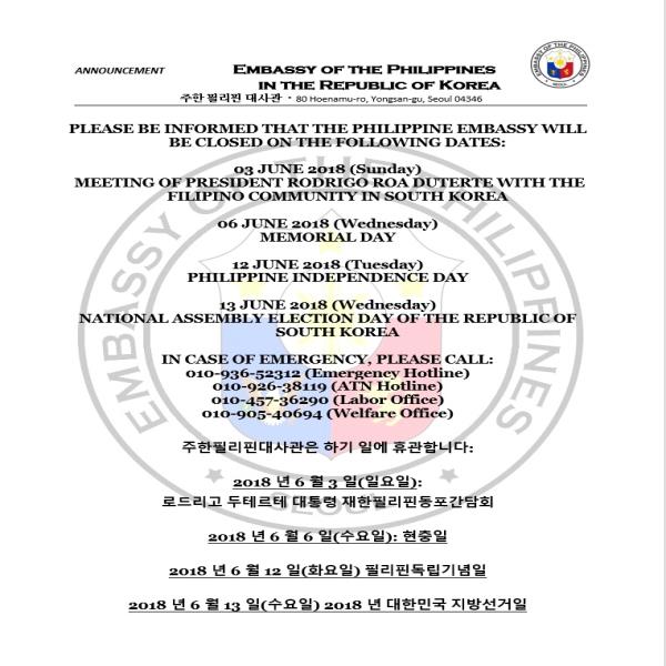 03 JUNE 2018 (Sunday) MEETING OF PRESIDENT RODRIGO ROA DUTERTE WITH THE FILIPINO COMMUNITY IN SOUTH KOREA 06 JUNE 2018 (Wednesday) MEMORIAL DAY 12 JUNE 2018 (Tuesday) PHILIPPINE INDEPENDENCE DAY 13 JUNE 2018 (Wednesday) NATIONAL ASSEMBLY ELECTION DAY OF THE REPUBLIC OF SOUTH KOREA IN CASE OF EMERGENCY, PLEASE CALL: 010-936-52312 (Emergency Hotline) 010-926-38119 (ATN Hotline) 010-457-36290 (Labor Office) 010-905-40694 (Welfare Office)