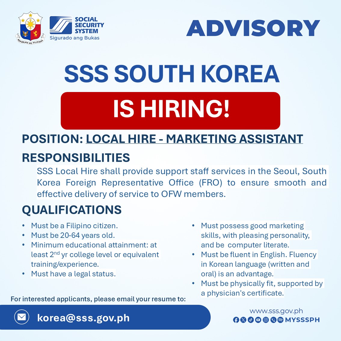 Kung mayroon po silang mga katanungan para sa karagdagang impormasyon, mangyaring makipag-ugnayan lamang po sa Embahada sa consular@philembassy-seoul.com o 010-9263-8119.