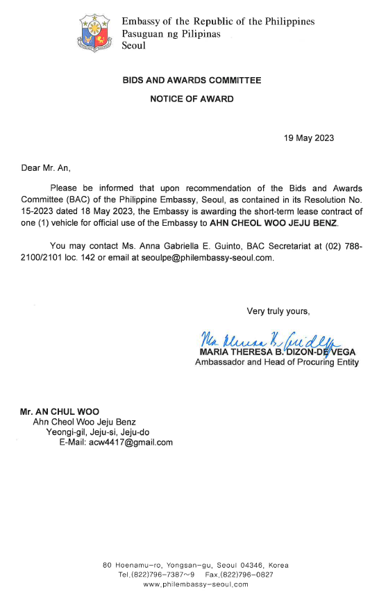 Dear Mr. Hong,Please be informed that, upon the recommendation of the Bids and Awards Committee of Philippine Embassy Seoul as contained in its Resolution No. 25 - 2023 dated 11 July 2023, the Embassy is awarding the procurement of its Office Supplies and Materials to BEST PLUS. The contract is valid for twelve (12) months effective 18 July 2023.The Embassy will pay the Company based on the Purchase Request and Purchase Order and the actual delivery of supplies indicated in the Technical Specification.Should you agree with the award of contract, please acknowledge receipt and acceptance of this notice by signing at the portion provided below.You may contact Ms. Anna Gabriella E. Guinto, BAC Secretariat at (02) 788-2100/2101 loc. 142 or email at anna.estimada@dfa.gov.ph.Very truly yours,MARIA THERESA B. DIZON-DE VEGAAmbassador and Head of Procuring EntityMr. HONG SEONG HWANHead, Best Plus678-1 Yeoksam-guGangnam-gu, SeoulConforme :____________