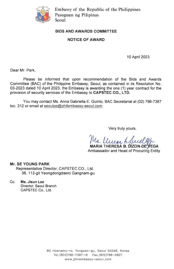 Dear Mr. Ryu,Please be informed that upon recommendation of the Bids and Awards Committee (BAC) of the Philippine Embassy, Seoul, as contained in its Resolution No. 17-2023 dated 07 June 2023, the Embassy is awarding to KCC AUTO CO., LTD. the contract for the procurement of one (1) brand new motor vehicle for official use of the Embassy.Should you have any inquiry, you may contact Ms. Anna Gabriella E. Guinto, BAC Secretariat at (02) 788-2100/2101 loc. 142 or email at anna.estimada@dfa.gov.ph.Very truly yours,MARIA THERESA B. DIZON-DE VEGAAmbassador and Head of Procuring EntityMr. RYU IN-JINCEO, KCC Auto Co., Ltd.142 Hannam-daero, Yongsan-gu, SeoulContact no.: 02-6328-7700