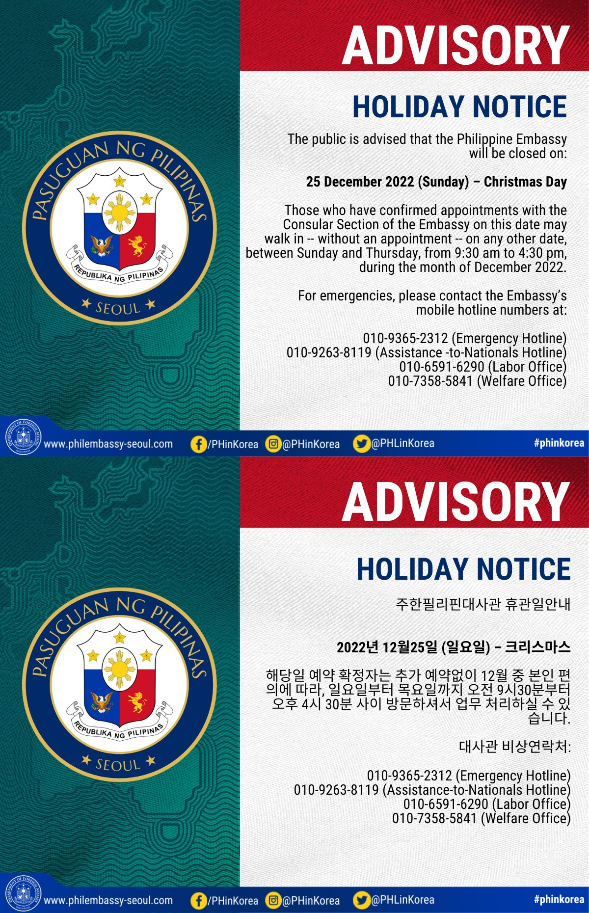09 April 2023 (Sunday) - Easter Sunday and Araw ng Kagitingan (PHL)Those who have confirmed appointments with the Consular Section of the Embassy on these dates may walk in -- without an appointment -- on any other date, between Sunday and Thursday, from 9:30 am to 4:30 pm, during the month of April 2023.For emergencies, please contact the Embassy's mobile hotline numbers at:010-9365-2312 (Emergency Hotline)010-9263-8119 (Assistance-to-Nationals Hotline)010-6591-6290 (Migrant Workers Office)010-7358-5841 (Overseas Workers Welfare Administration)