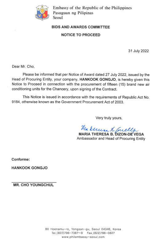 20 November 2022Dear Mr. Kim,Please be informed that upon recommendation of the Bids and Awards Committee (BAC) of the Philippine Embassy, Seoul, as contained in its Resolution No. 43-2022 dated 20 November 2022, the Embassy is awarding to JOEUNN NETWORKS CO., LTD. for the contract for the rehabilitation of the network cabling of the Chancery for the IP PBX.Should you have any inquiry, you may contact Ms. Anna Gabriella E. Guinto, BAC Secretariat at (02) 796-7387 loc. 312 or email at anna.estimada@dfa.gov.ph.Very truly yours,MARIA THERESA B. DIZON-DE VEGA Ambassador and Head of Procuring EntityMr. JANG YEOL KIMCEO, Joeunn Networks Co., Ltd.2F Gwanghee Building, 266,Banghwa-daero, Gangseo-gu, SeoulContact no.: 010-9044-9088E-mail: help@jens.co.kr