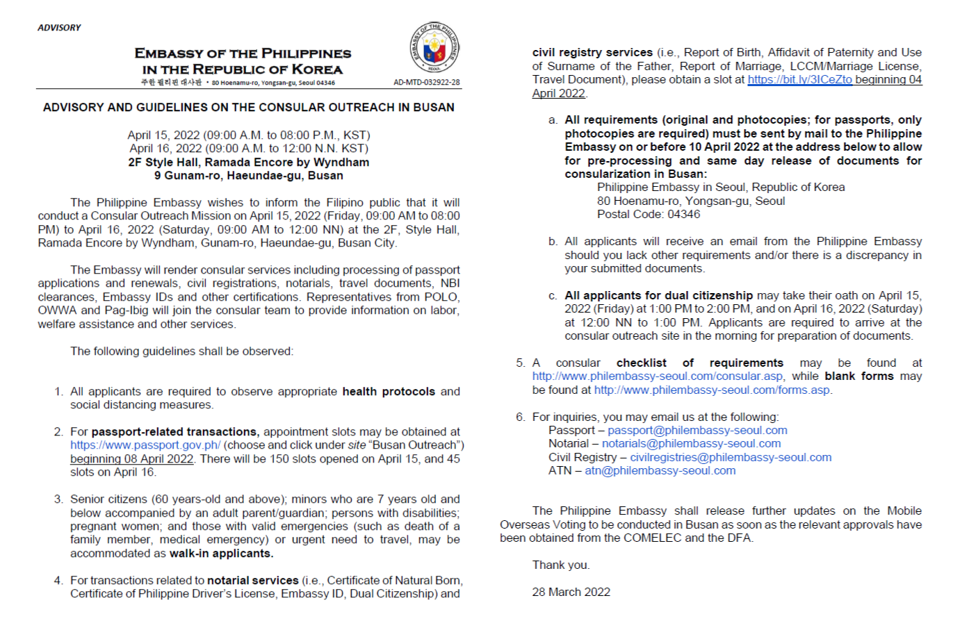 The Philippine Embassy respectfully informs the public that in compliance with Section 68(d) of COMELEC Resolution no. 10751 and Section 38(c) of COMELEC Resolution no. 10751 both dated 12 January 2022, the Election Returns (ERs) and Certificates of Canvass (COCs) of votes cast in South Korea are posted at the Philippine Embassy lobby and Consular Section, respectively.