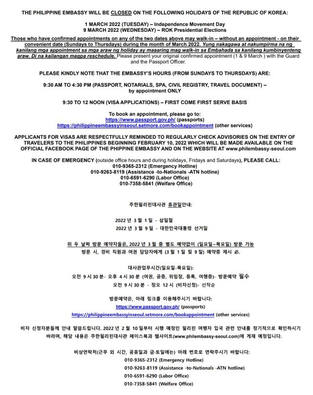 The Overseas Voting for the 2022 Philippine National Elections will be conducted in-person from 10 April 2022 to 9 May 2022 at Sentro Rizal Hall, Room 202, Philippine Embassy, 80 Hoenamu-ro, Yongsan-gu, Seoul, South Korea 04346