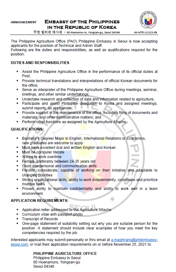PLEASE KINDLY NOTE THAT THE EMBASSY'S HOURS (FROM SUNDAYS TO THURSDAYS) ARE:9:30 AM TO 4:30 PM (PASSPORT, NOTARIALS, SPA) - by appointment ONLY9:30 AM TO 12 NOON (VISA APPLICATIONS) - FIRST COME FIRST SERVE BASISTo book an appointment, please go to:https://www.passport.gov.ph/ (passports)https://philippineembassyinseoul.setmore.com/bookappointment (other services)APPLICANTS FOR VISAS ARE RESPECTFULLY REMINDED THAT THE PHILIPPINES IS NOT YET ALLOWING THE ENTRY OF TRAVELERS FOR VISIT PURPOSES ONLY. FOR MORE INFORMATION ON PERSONS WHO ARE ALLOWED ENTRY AT THIS TIME, KINDLY REFER TO ADVISORIES ON THE OFFICIAL FACEBOOK PAGE OF THE PHIPPINE EMBASSY AND ON THE WEBSITE AT www.philembassy-seoul.comIN CASE OF EMERGENCY (outside office hours and during holidays, Fridays and Saturdays), PLEASE CALL:010-9365-2312 (Emergency Hotline)010-9263-8119 (Assistance -to-Nationals -ATN hotline)010-6591-6290 (Labor Office)010-7358-5841 (Welfare Office)