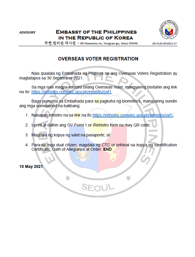 31 August 2021 (Tuesday)ACTIVITY: For the transfer of voting registration records from South Korea to the PhilippinesDATE:30 September 2021 (Thursday)ACTIVITY:Overseas voting registrationThose who wish to register or transfer their voting registration records to the Philippines may visit the Embassy during our business hours, 10:00 am - 12:00 noon and 1:00 pm - 3:00 pm, Sunday to Thursday (except holidays).Please bring your valid Philippine passport.For your guidance.Thank you.END.