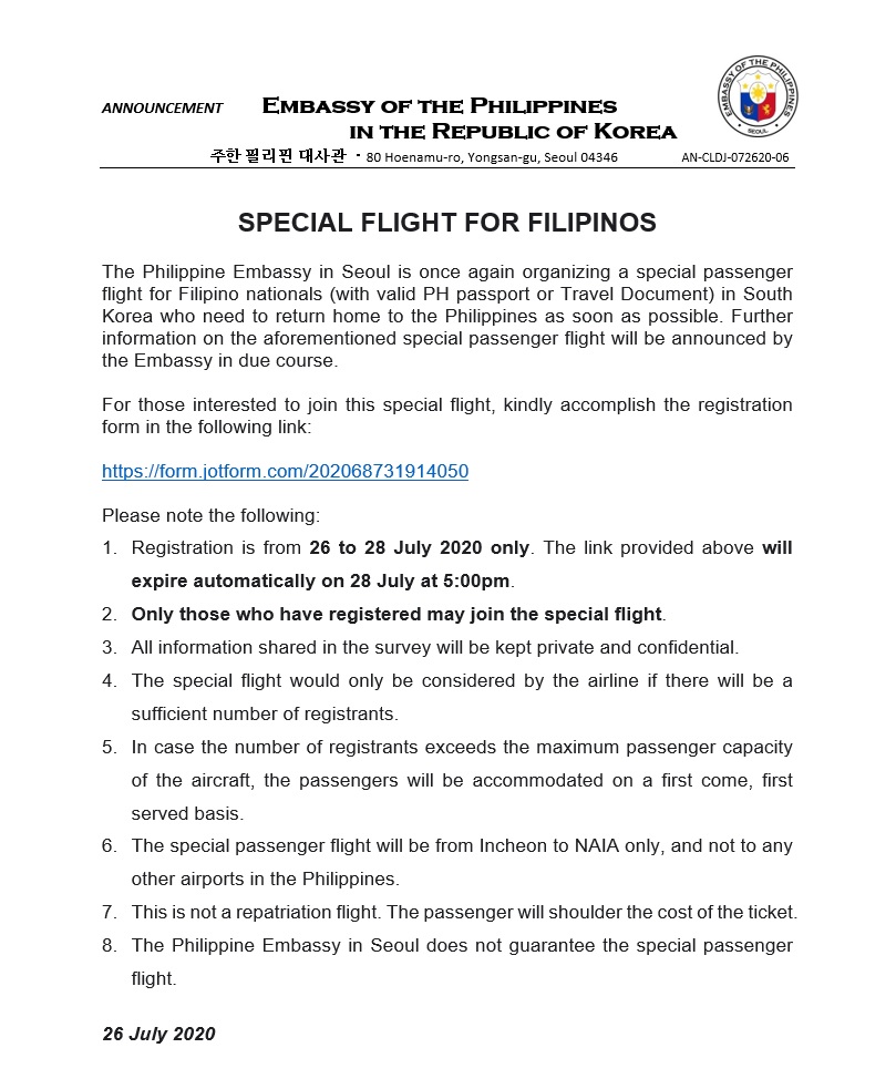 The Philippine Embassy in Seoul wishes to inform the public of the following guidelines set forth by the Bureau of Immigration regarding the visa-free entry of Filipino nationals, including former Filipinos, and members of their family: