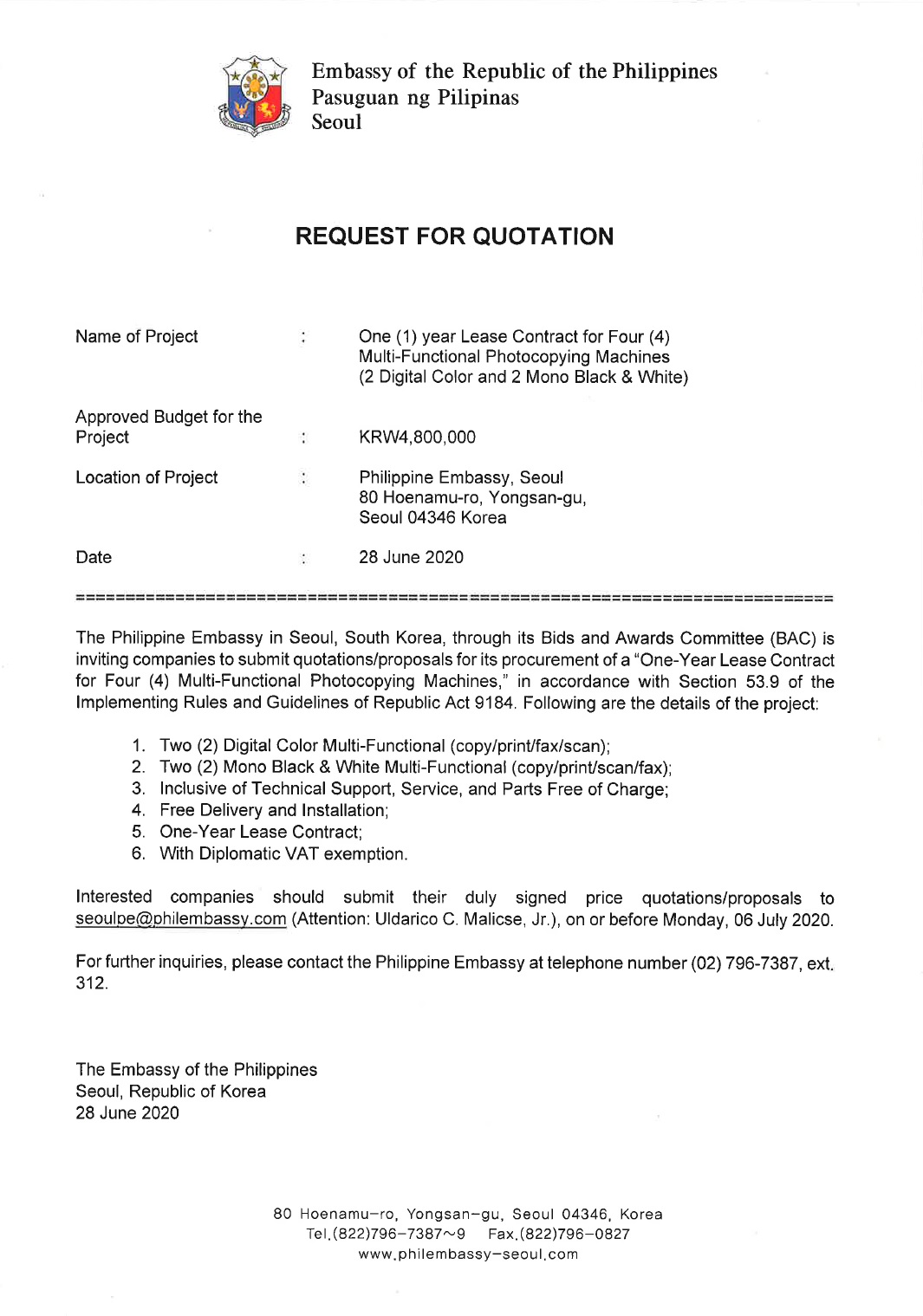The Philippine Embassy in Seoul, South Korea, is inviting companies to submit quotations for the procurement of Janitorial Cleaning Services of its office premises, in accordance with Section 53.9 of the Implementing Rules and Guidelines of Republic Act 9184.