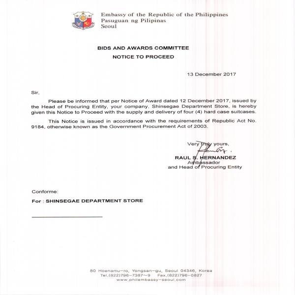 NOTICE OF AWARD 04 July 2018Sir, Please be informed that upon recommendation of the Bids and Awards Committee (BAC) of the Philippine Embassy, Seoul, as contained in its Resolution No. 11 - 2018 dated 03 July 2018, the Embassy is awarding to RK Docu Solution the One (1) year Lease Contract of Two (2) colored and Two (2) black & white multi-functional photocopying machines to the Philippine Embassy. You may contact Mr. Anthony Z. Cornista, BAC Secretariat at (02) 796-7387 loc. 312 or email at seoulpe@philembassy-seoul.com. Very truly yours, RAUL S. HERNANDEZ Ambassador and Head of Procuring EntityRK DOCU SOLUTION Attention: JIYOUNG LIM 108-28 Beolmai-ro, Guri-si, Gyeonggi-do Email: canon4u@nate.com