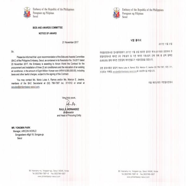 24 April 2018Sir,Please be informed that upon recommendation of the Bids and Awards Committee (BAC) of the Philippine Embassy, Seoul, as contained in its Resolution No. 04-2018 dated 23 April 2018, the Embassy is awarding to Seoul Yu Tong the one (1) year Contract for the supply of drinking mineral water to be supplied to the Philippine Embassy.You may contact Mr. Anthony Z. Cornista, BAC Secretariat at (02) 796-7387 loc. 312 or email at seoulpe@philembassy-seoul.com.Very truly yours,RAUL S. HERNANDEZAmbassador and Head of Procuring EntityMr. KIM InsungSeoul Yu Tong