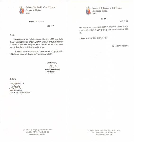 14 September 2017Sir, Please be informed that per Notice of Award dated 12 September 2017 issued by the Head of Procuring Entity, your company, Hankook Banje, is hereby given this Notice to Proceed with providing a pest control service to the Philippine Embassy. This Notice is issued in accordance with the requirements of Republic Act No. 9184, otherwise known as the Government Procurement Act of 2003. Very truly yours, RAUL S. HERNANDEZ Ambassador and Head of Procuring EntityConforme:For : HANKOOK BANGJE______________________