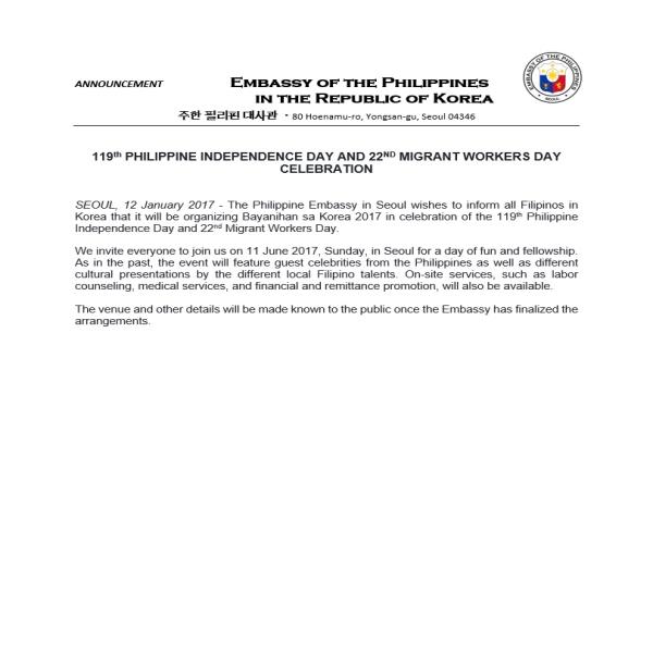 The Philippine Embassy wishes to invite the Filipino Community in South Korea, particularly those in the south, to attend its forum tomorrow at the Gimhae Support Center for Foreign Workers, Joy Building 6th flr. 81 Garak-ro, Gimhae-Si, Gyeongsangnam-do, Gimhae, Korea) from 2 to 4 in the afternoon.