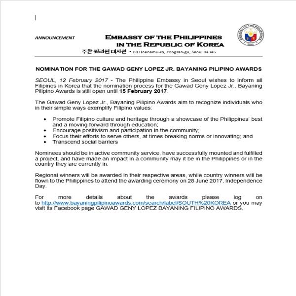 NOTICE OF AWARD 22 August 2017Sir, Please be informed that upon recommendation of the Bids and Awards Committee of the Philippine Embassy, Seoul, as contained in its Resolution No. 12-2017 dated 13 July 2017, the Embassy is awarding the Contract to Daeyoung Management for the provision of a staff to clean the Philippine Embassy Chancery for five (5) hours from 12:30 p.m. to 5:30 p.m. from Sundays to Thursdays excluding Korean holidays, for a period of 12 months, in the amount of One Million three hundred ninety-seven thousand Korean won (KRW1,397,000) only per month, including taxes and other lawful charges, subject to the signing of the Contract. You may contact Ms. Maria Luisa A. Ramos and/or Ms. Maricor E. Jesalva, members of the BAC Secretariat at (02) 796-7387 loc. 311/312 or email at seoulpe@philembassy-seoul.com. Very truly yours, RAUL S. HERNANDEZ Ambassador and Head of Procuring EntityMR. CHOI JAE HO Chief Executive Officer Daeyoung Management Room 520, 272 Gwanakdaero, Dongan-gu Anyang-si, Gyeonggi-do