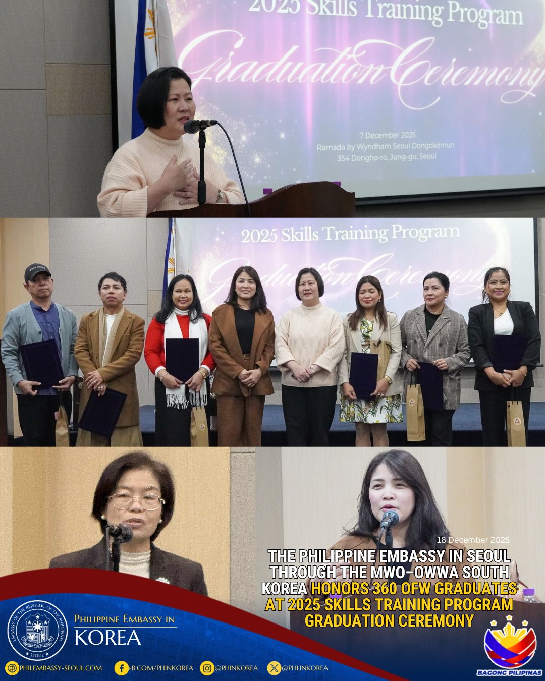 December 7, 2025, Seoul. The Philippine Embassy in Seoul, through the Migrant Workers Office (MWO) and the Overseas Workers Welfare Administration (OWWA) in South Korea, successfully held the 2025 Skills Training Program Graduation Ceremony on December 7, 2025, at the Ramada by Wyndham Seoul Dongdaemun, celebrating the achievements of 360 Overseas Filipino Worker (OFW) graduates who completed various livelihood and skills training courses throughout the year.