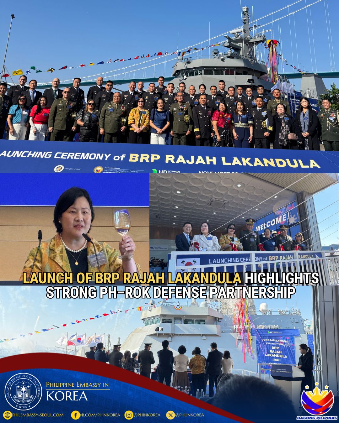 Ulsan, Republic of Korea – The Philippine Embassy in Seoul, led by Ambassador-designate Bernadette Therese Fernandez, joined the official launching of the BRP Rajah Lakandula on 20 November 2025 at the HD Hyundai Heavy Industries (HHI) shipyard in Ulsan, highlighting the expanding strategic and economic significance of the Philippine–Republic of Korea defense partnership, particularly in the area of defense industrial cooperation.  Representing the Philippines in the ceremony were Navy Vice Commander MGen Edwin E. Amadar, AFP Vice Chief of Staff LtGen Jimmy D. Larida, and Defense Procurement Service Chief Atty. Effie R. Agsaoay. The Ambassador-designate was also accompanied by officers of the Embassy, First Secretary and Consul Flaureen Dacanay, Third Secretary and Vice Consul Reisha Olavario, and Philippine Defense Attaché to the ROK Col. Don Templonuevo. HD HHI was led by President/COO of Naval & Medium Size Ship Building Business Unit Joo Wonho. In his remarks, Vice Commander Amadar emphasized that the vessel’s launch demonstrates the Philippine Navy’s commitment to a modern, credible, and self-reliant force capable of safeguarding national and regional stability. He also highlighted that the OPV program reflects the growing trust and cooperation between the Philippines and the ROK, built on shared values and a vision for long-term peace and security. Designed for long-range and sustained operations, the BRP Rajah Lakandula will support anti-smuggling, anti-piracy, disaster relief, and extended patrols across the Philippine Exclusive Economic Zone, significantly expanding Philippine maritime security coverage. Ambassador-designate Fernandez, in a ceremonial toast, reaffirmed that defense cooperation with the Republic of Korea is now an essential pillar of bilateral relations. She emphasized that naval modernization not only strengthens the Philippines’ security posture but also stimulates economic activity, facilitates technology partnerships, and supports Filipino workers in the ROK’s shipbuilding sector. In her discussions with HHI leadership, the Ambassador-designate commended the early delivery of Philippine vessels and underscored the importance of worker welfare and sustained defense industrial cooperation. The BRP Rajah Lakandula launch is a tangible example of how strategic defense partnerships can deliver both security capabilities and long-term economic value. The Philippine Embassy will continue to advance these priorities as part of its broader mandate to strengthen PH–ROK strategic partnership in the years ahead. END