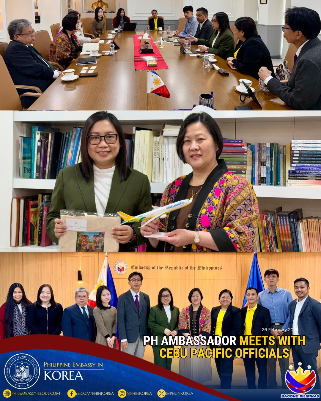 Above photo: DOT's Love the Philippines Food Truck stationed at Hongik University on 21 August 2024. Below photo (L): Ambassador Theresa Dizon-De Vega, AKC Secretary General Kim Jae Shin and Assistant Secretary Gissela Marie R. Quisumbing pose for a photo during the food truck event at the Korea Press Center.