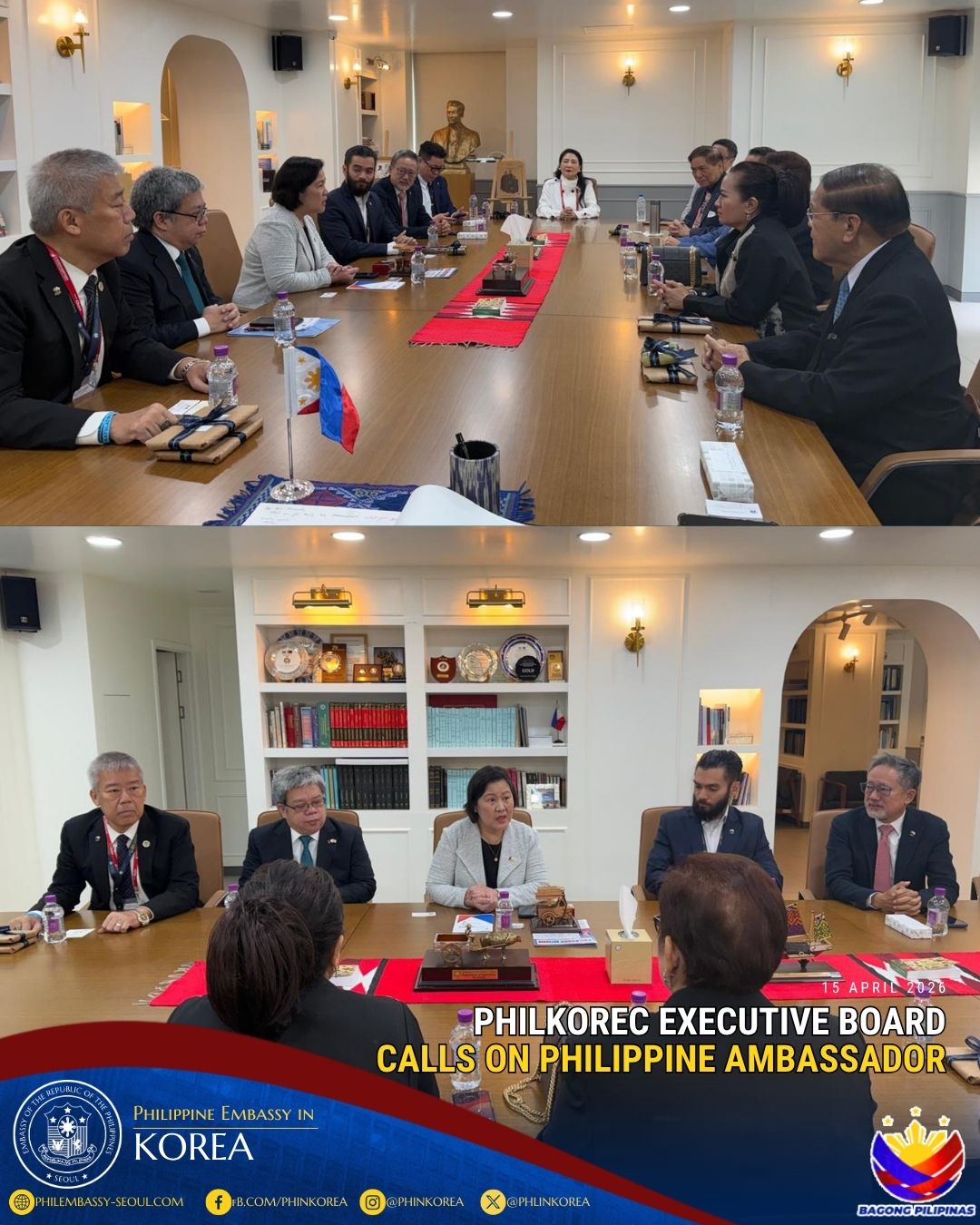 The Philippine delegation held a bilateral meeting with Jeju Special Self-Governing Province Governor Oh Young Hun where both sides discussed the importance of strengthening people-to-people ties through greater air connectivity, two-way tourism, and youth and academic exchanges. Members of the Philippine Congress highlighted the importance of overseas Filipinos in South Korea to the Philippine economy and requested the Governor to continue to look after the welfare of those living in Jeju Island through multi-cultural programs and other initiatives.